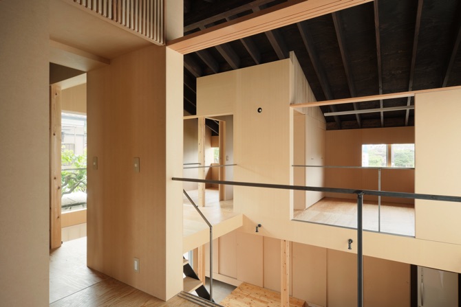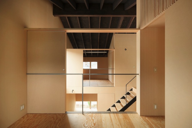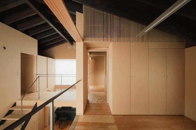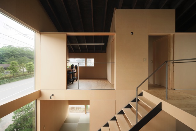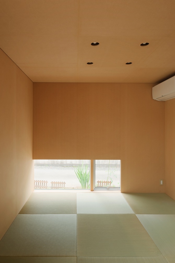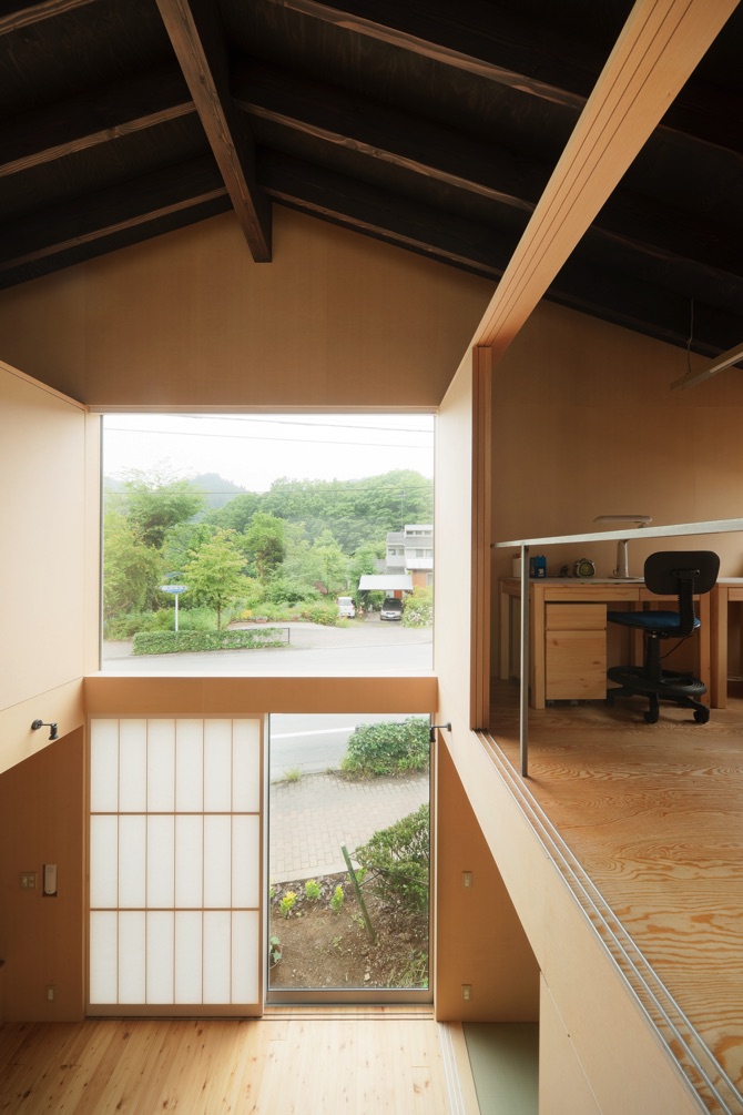 The house was planned as a ‘detached house’ for the children in what used to be the front garden of the main house of the parents' household. Therefore, the volume of the house is kept as low and simple as possible so as not to impact on the environment of the main house. The central part of the symmetrical composition is the atrium, which has a large opening so that the view can penetrate through the space. When looking at the building from the street, we wanted the viewer to be able to penetrate the interior space through the windows and become aware of the exterior space behind it. The exterior, on the other hand, is plain siding with a clear paint finish to make it as rustic as possible. The sliding sash at the bottom of the opening was made from ready-made materials, while the upper fix sash was fabricated on site to match the width of the lower sash. The simple fix sash, made from aluminium steel and timber, looks cleaner than off-the-shelf products, but does not have the ostentatious factory-fabricated appearance. The interior walls are made of MDF and the frames of the openings are also finished in MDF. The view from the window passes through the light material of the MDF to the window on the other side.