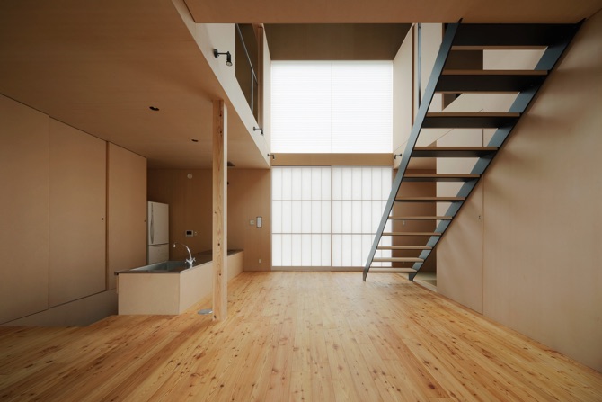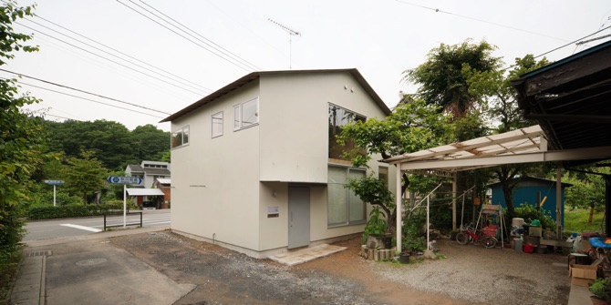親世帯の母屋の前庭だったところに子世帯のための「離れ」として計画した。そのため、母屋の環境にできるだけインパクトを与えないよう、ボリュームを抑えたシンプルな形状としている。シンメトリー構成の中心を吹き抜けとし、その空間を視界が突き抜けるように大きく開口を設けた。道路からこの建物を見たとき、窓から内部空間を突き抜けてその奥の外部空間にまで意識がいくことができたらと考えたのだ。一方、外観はできるだけ素朴な存在とするため、無地のサイデイングをクリア塗装で仕上げている。開口の下部の引き違いサッシは既成品を使用し、上部のフィックスサッシは下部のサッシの幅に合わせて現場で製作した。アルミの鋼材や木材を使い簡素に製作したフィックスサッシは既製品よりもすっきり見え、かといって工場で加工したもののような仰々しさはない。内部の壁はMDFで統一し、開口部の額縁もMDFで仕上げてある。窓からの風景がMDFのさらりとした素材を通り抜けて反対側の窓へとつながっていく。