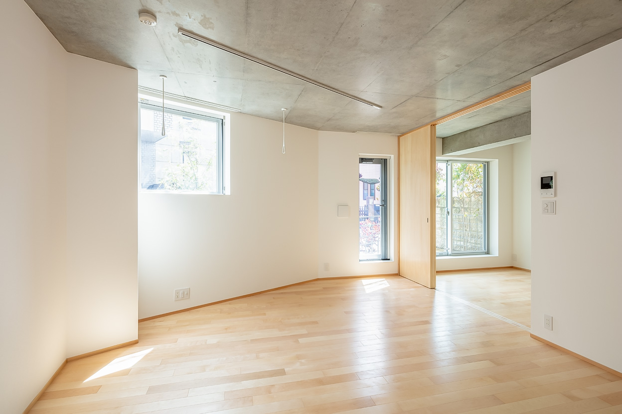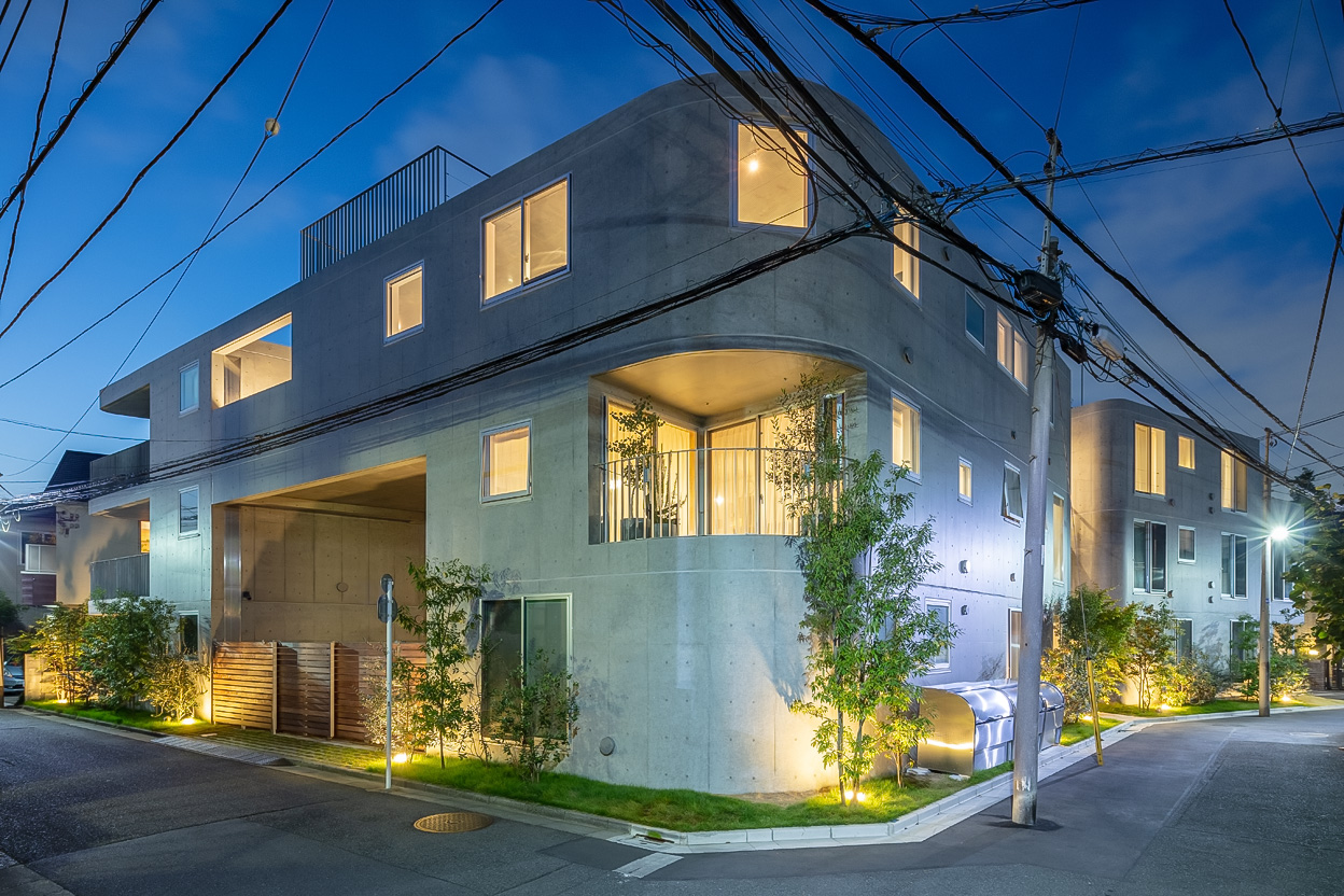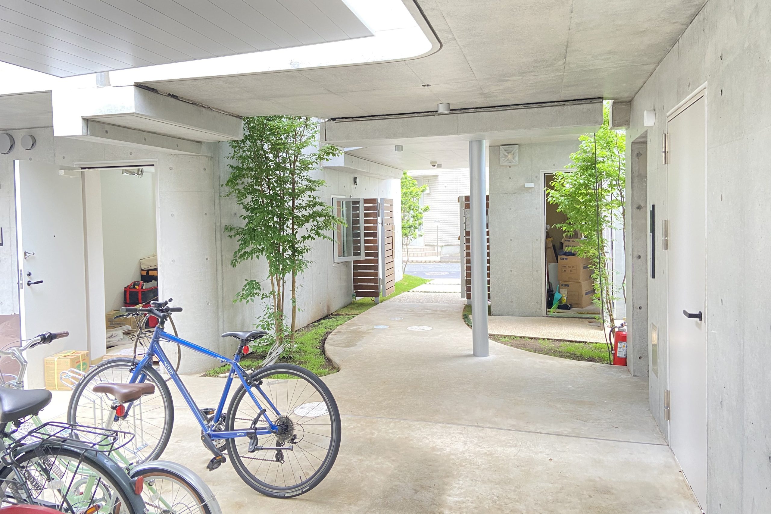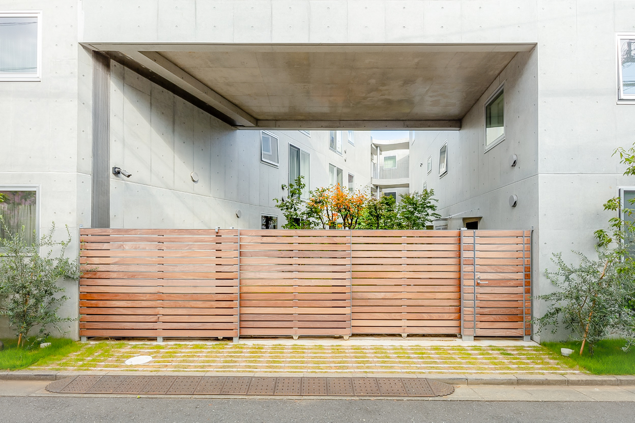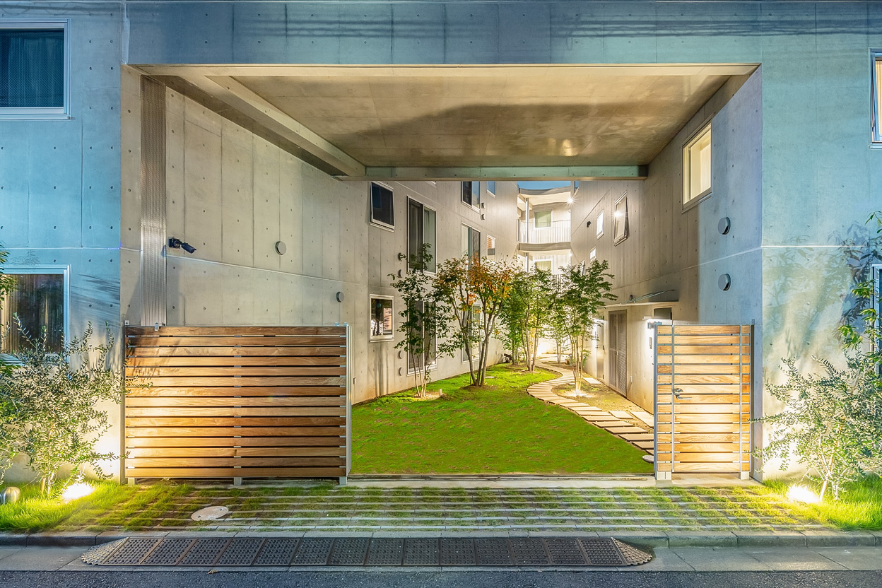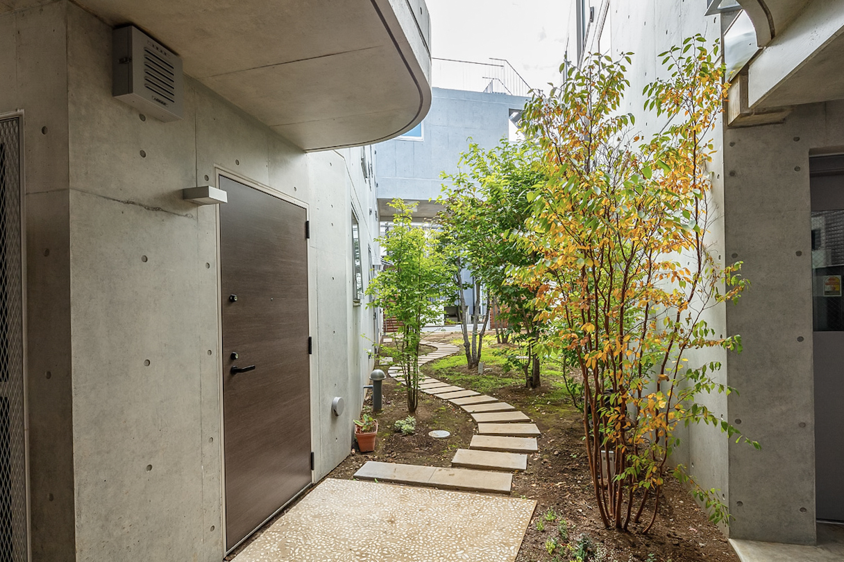 Three storeys were secured while keeping the height as low as possible so as not to disrupt the streetscape of the surrounding buildings. The building is divided into three buildings, which are arranged in a ‘C’ shape on the trapezoidal site, leaving a courtyard that opens onto the road on the south side. There used to be a lush green garden on this site. The trees in it were relocated during construction and returned to this courtyard after the building was completed. The courtyard is connected to the road by a gate that can be opened and closed, providing not only a pleasant environment for the residents, but also an event space for flea markets and other events in which the neighbourhood can participate. It is hoped that the greenery in the courtyard will gradually take root and flourish together with the residents of this building.