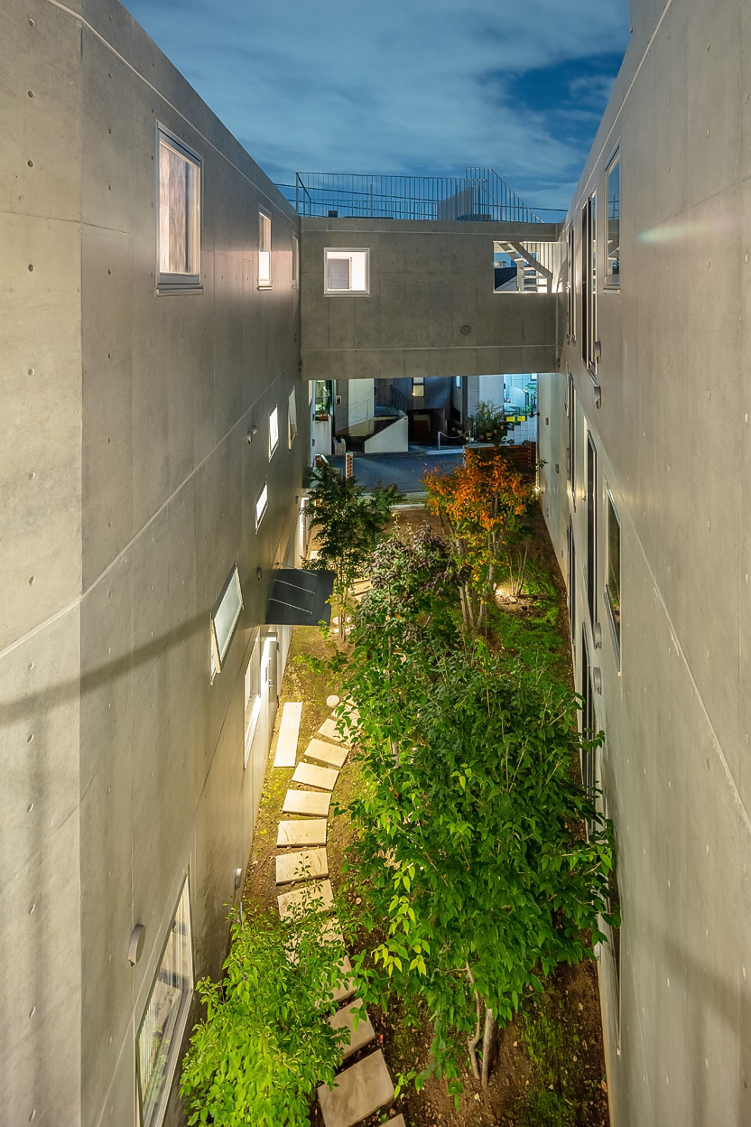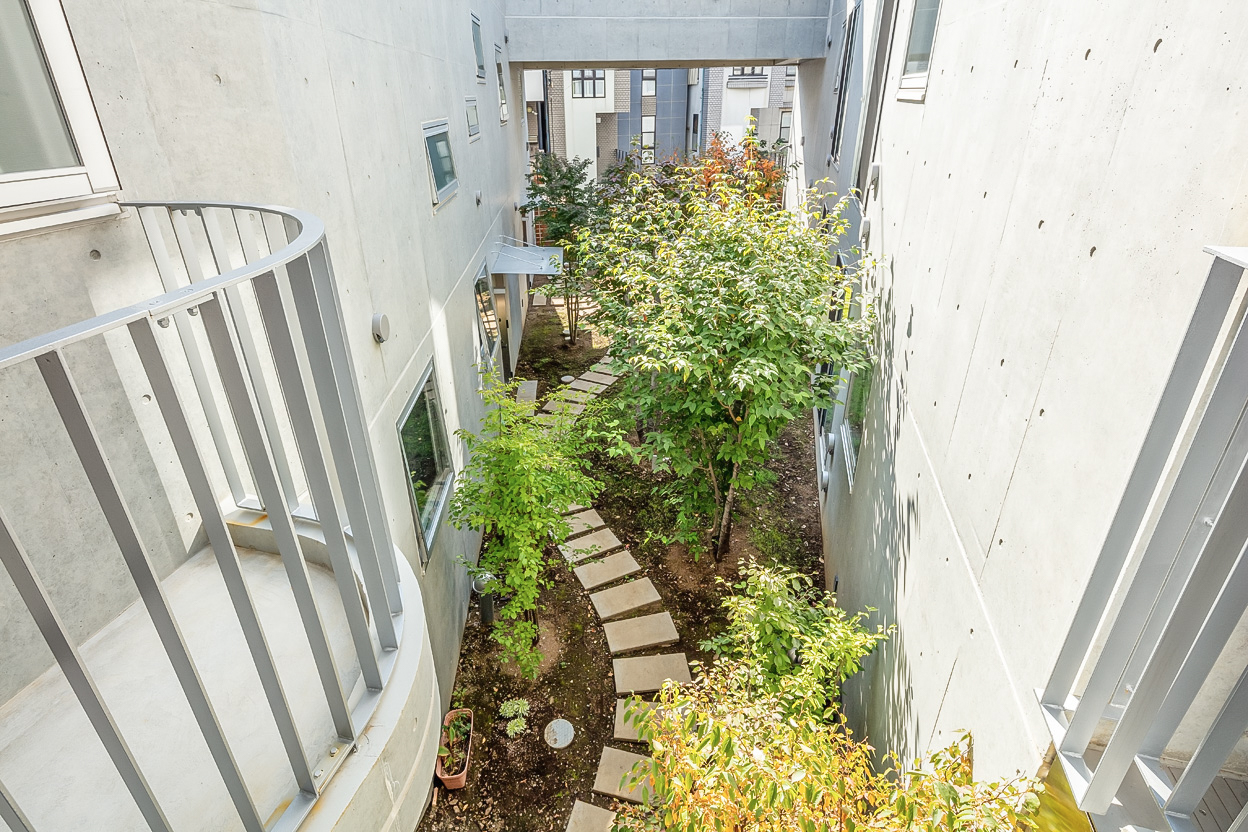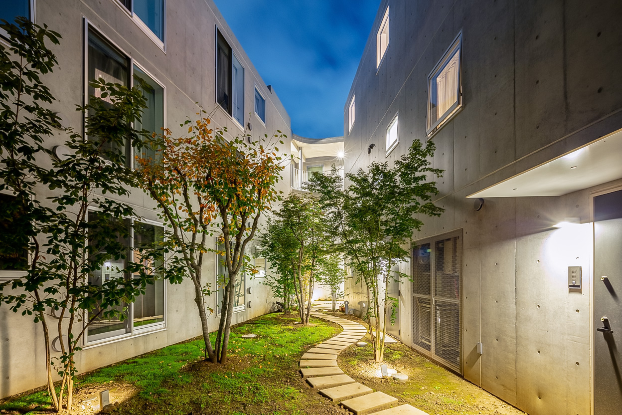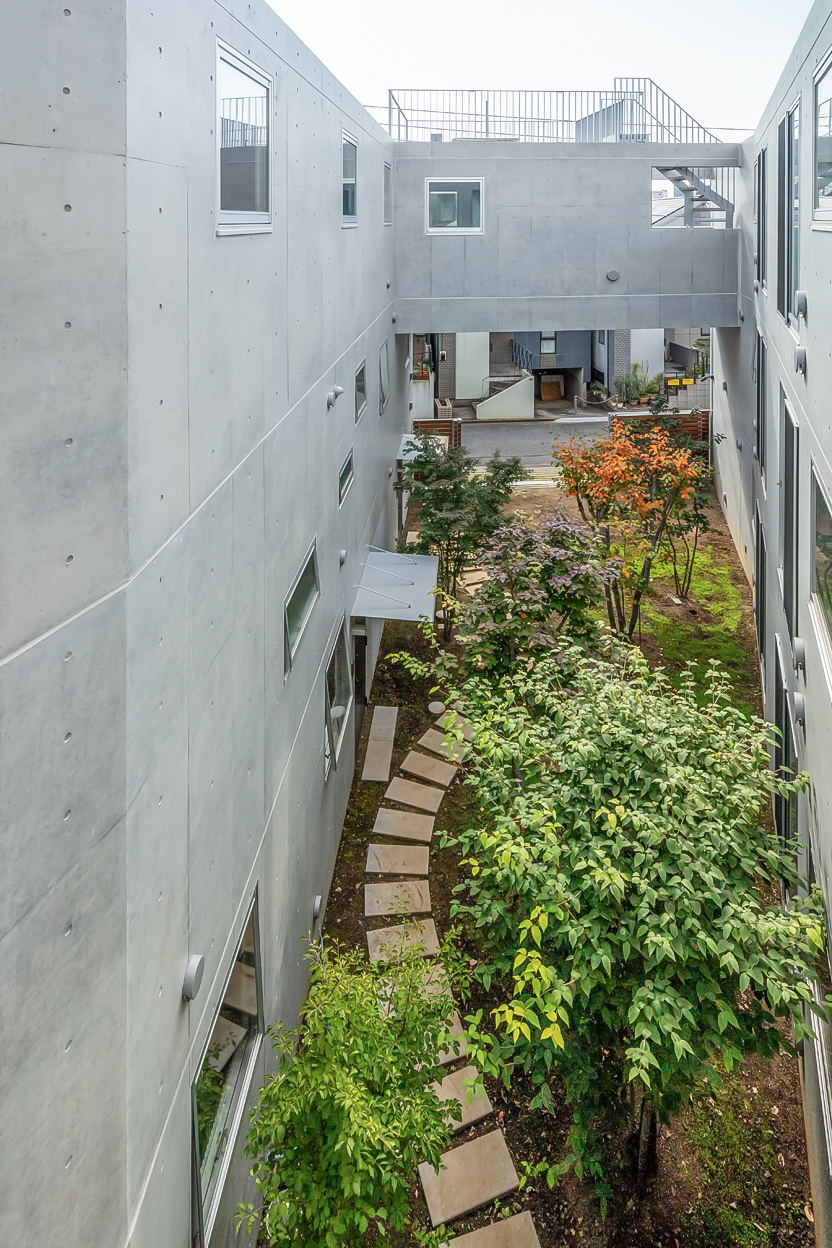 まわりの建物の街並みをできるだけ崩さないように高さを抑えつつ3層を確保した。建物は3棟に分割し、台形の敷地に対してハの字広がるように配置することで、南側の道路に開くような中庭を残した。ここの敷地には、以前、緑豊かなお庭があった。その中の樹木を工事中は移設して、建物完成後この中庭に戻した。中庭は開閉できるゲートで道路につながっており、住民の方々のための快適な環境となるだけでなく、近隣の方々も参加するフリーマーケットなどのイベントスペースとしても活用できる。中庭の緑はこの建物の住民とともに少しずつ根付き、花開いていくことを期待している。