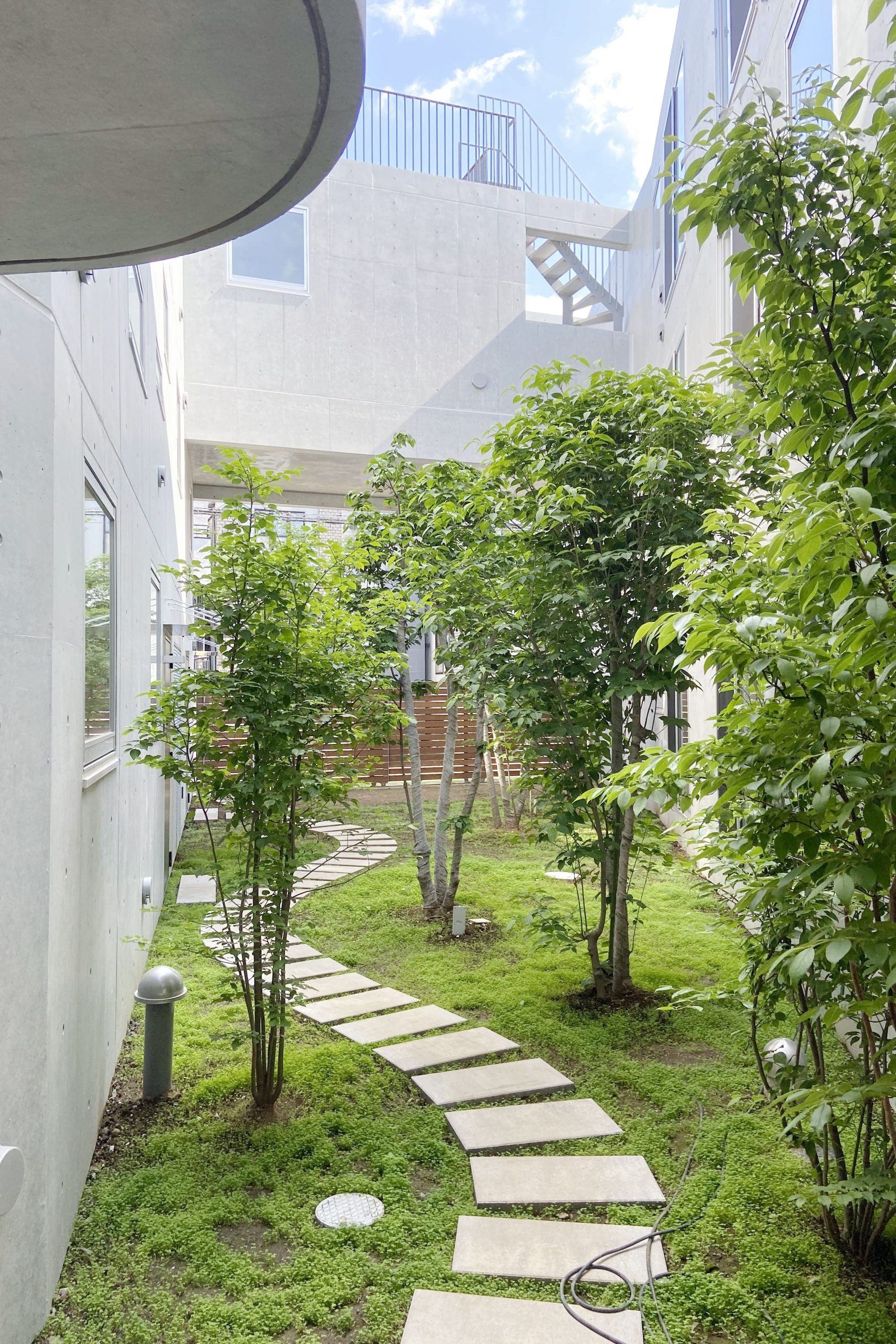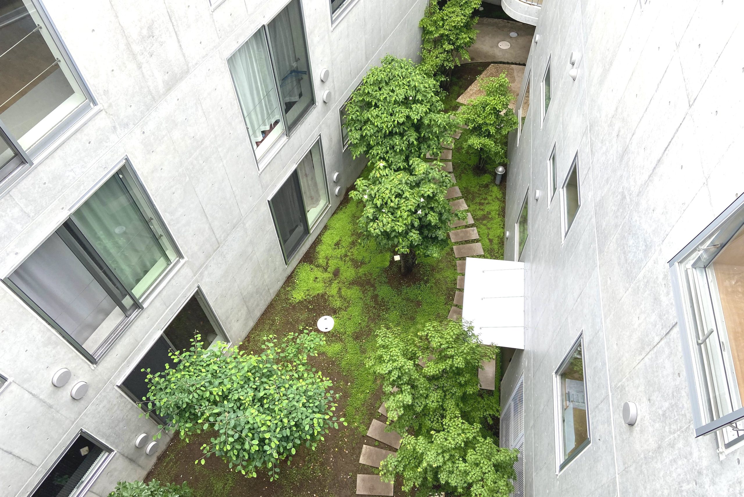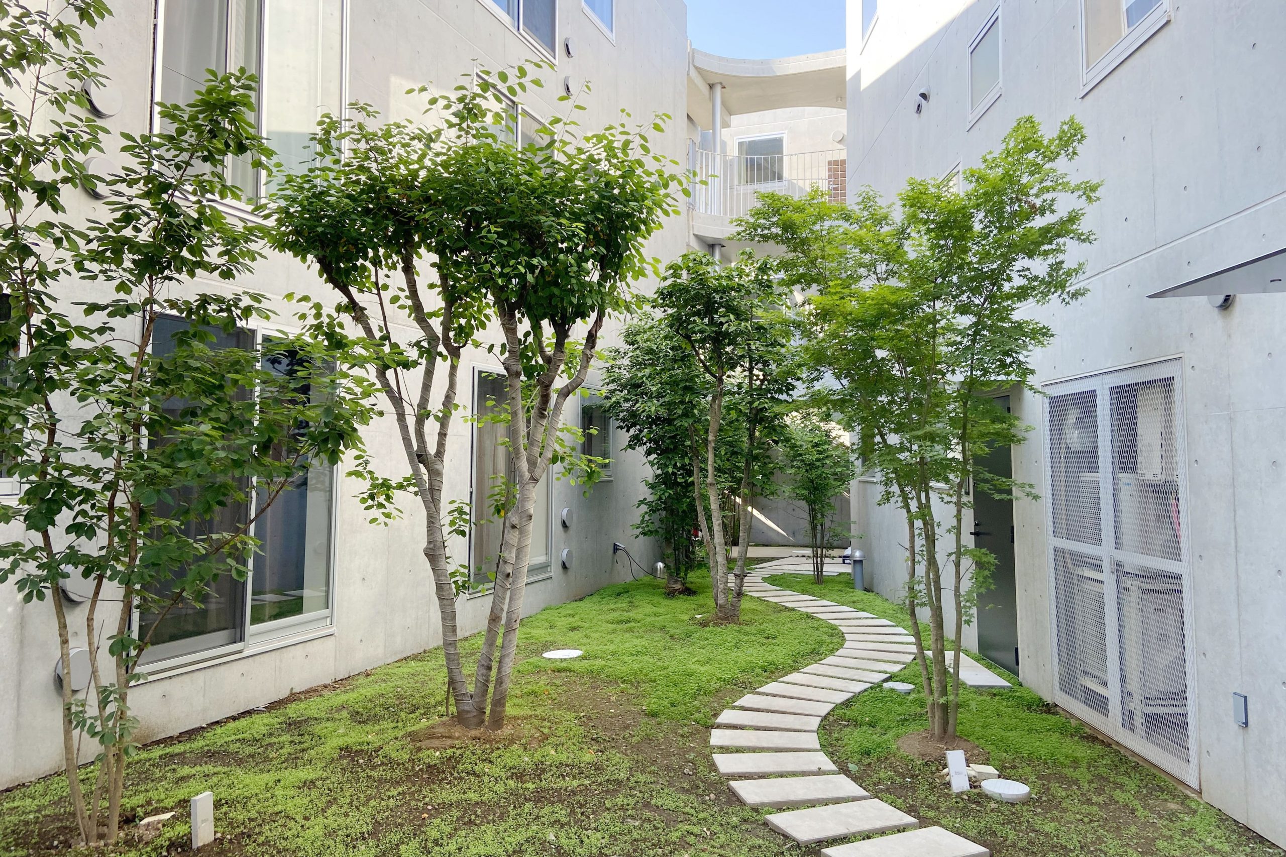 まわりの建物の街並みをできるだけ崩さないように高さを抑えつつ3層を確保した。建物は3棟に分割し、台形の敷地に対してハの字広がるように配置することで、南側の道路に開くような中庭を残した。ここの敷地には、以前、緑豊かなお庭があった。その中の樹木を工事中は移設して、建物完成後この中庭に戻した。中庭は開閉できるゲートで道路につながっており、住民の方々のための快適な環境となるだけでなく、近隣の方々も参加するフリーマーケットなどのイベントスペースとしても活用できる。中庭の緑はこの建物の住民とともに少しずつ根付き、花開いていくことを期待している。