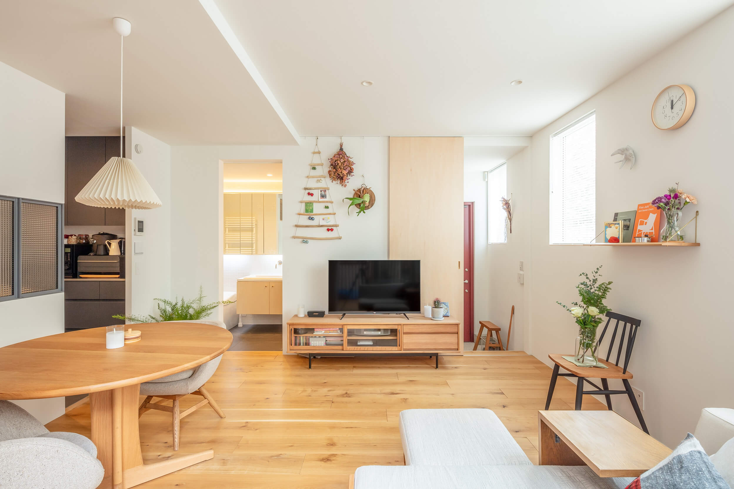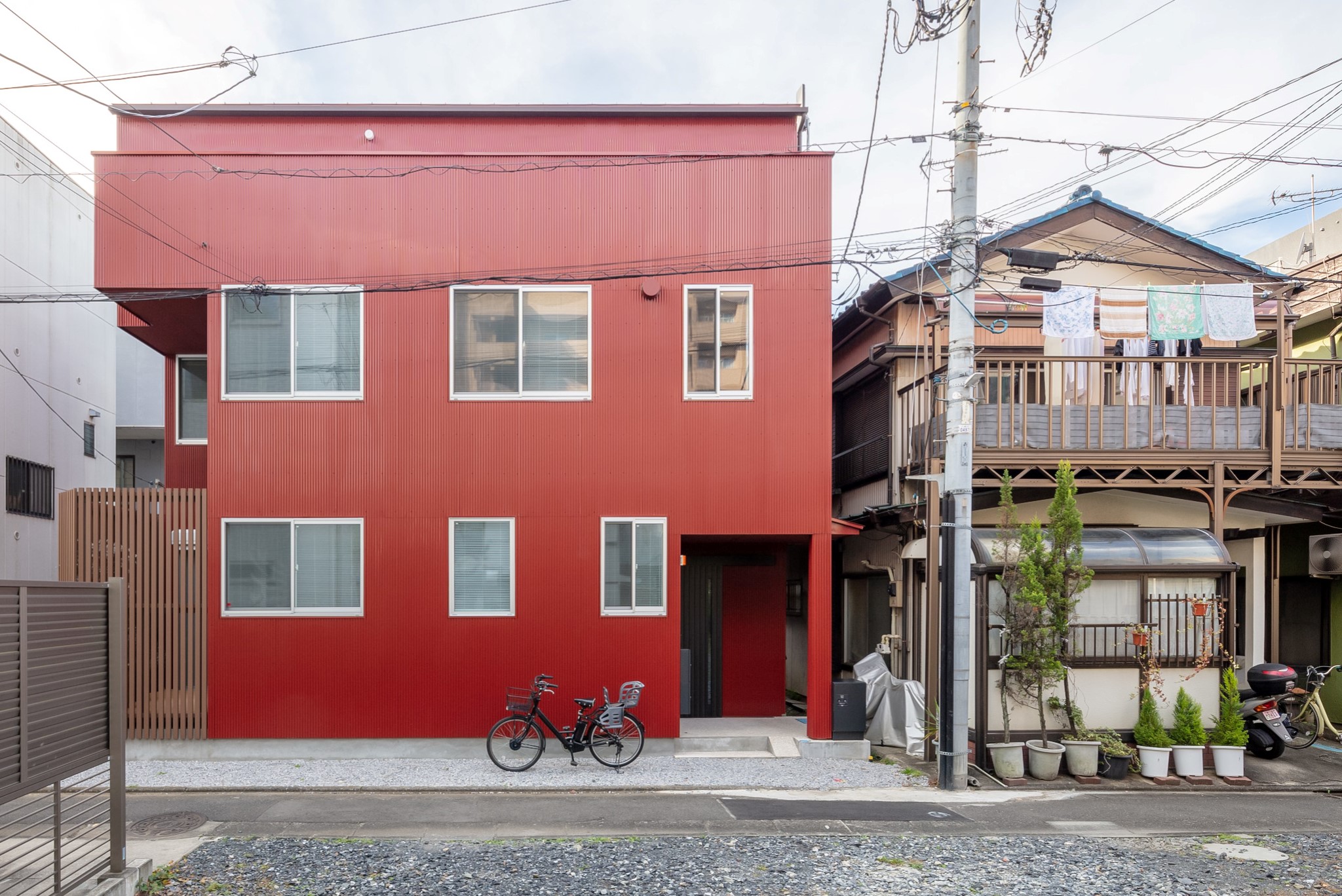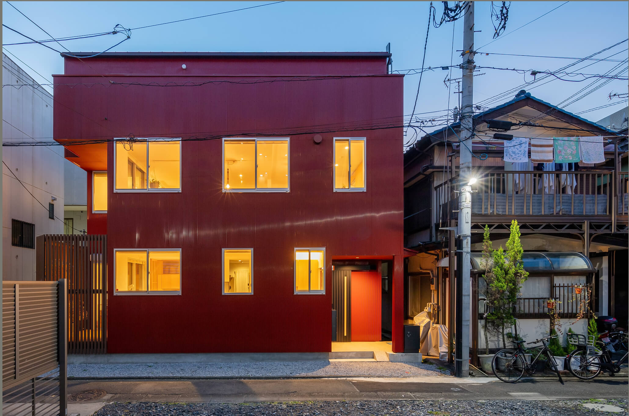 The new house is a three-storey, two-family house, with separate households on the first, second and third floors. The front road is only about 2m wide, so the site area was reduced as a setback. The second floor has a large opening to a vacant lot on the south side, again allowing light and wind to enter the rooms from there. The external walls are made of galvalume corrugated sheet, which is easy to maintain, and the colour is wine red, which is in keeping with the nostalgic atmosphere of the town. The interior is decorated in the owner's favourite natural modern style, creating a cosy space. The house is certified as a long-term quality house with high airtightness and thermal insulation.