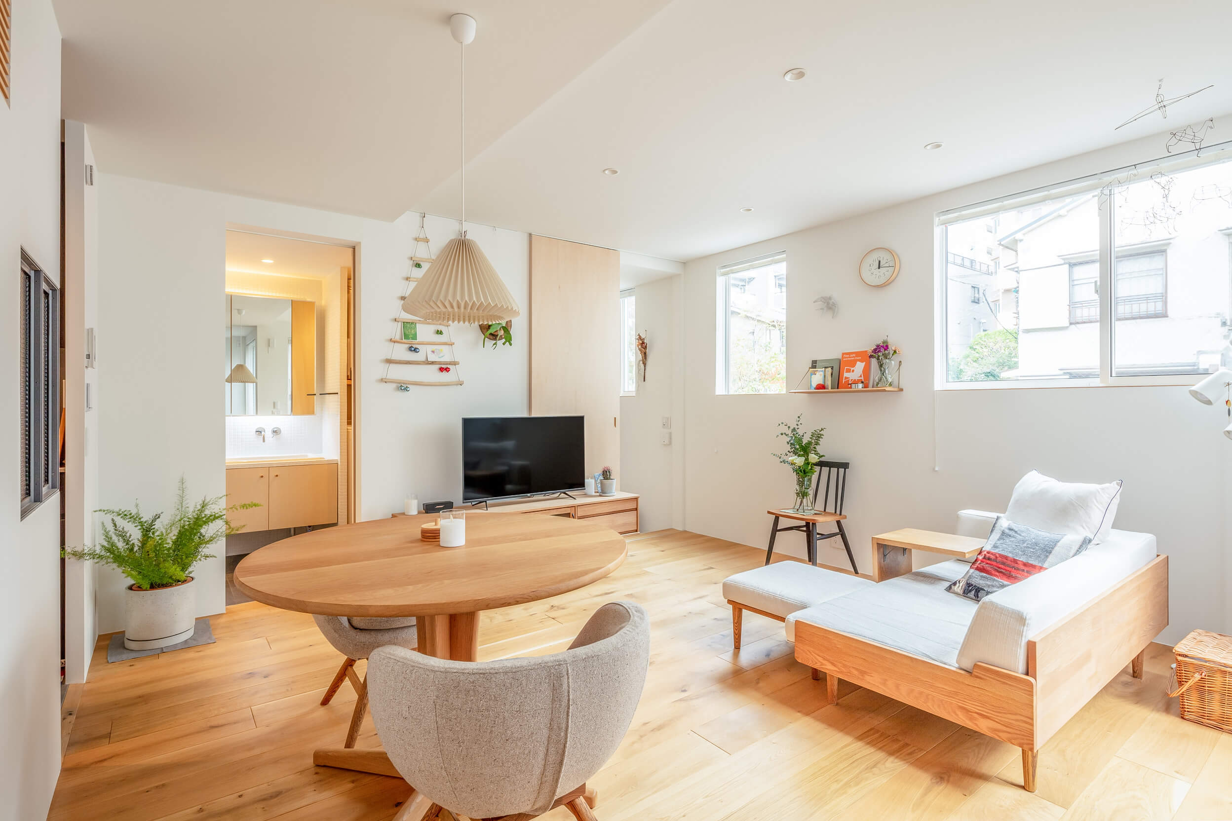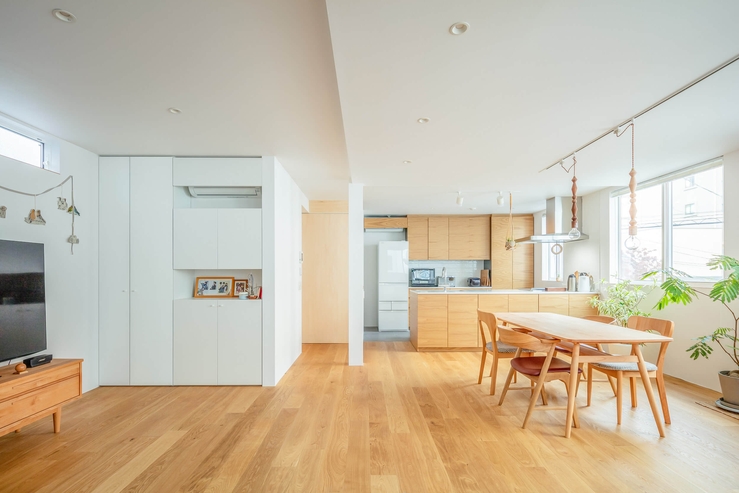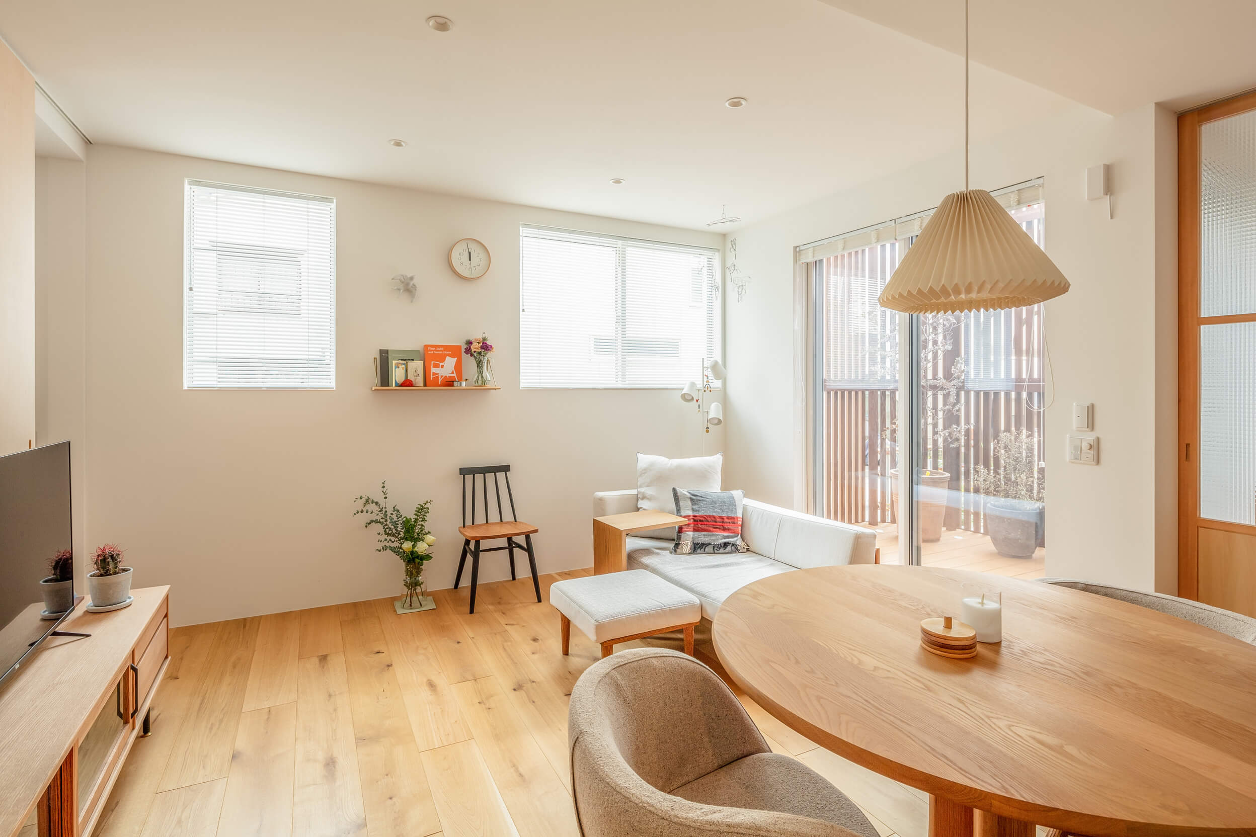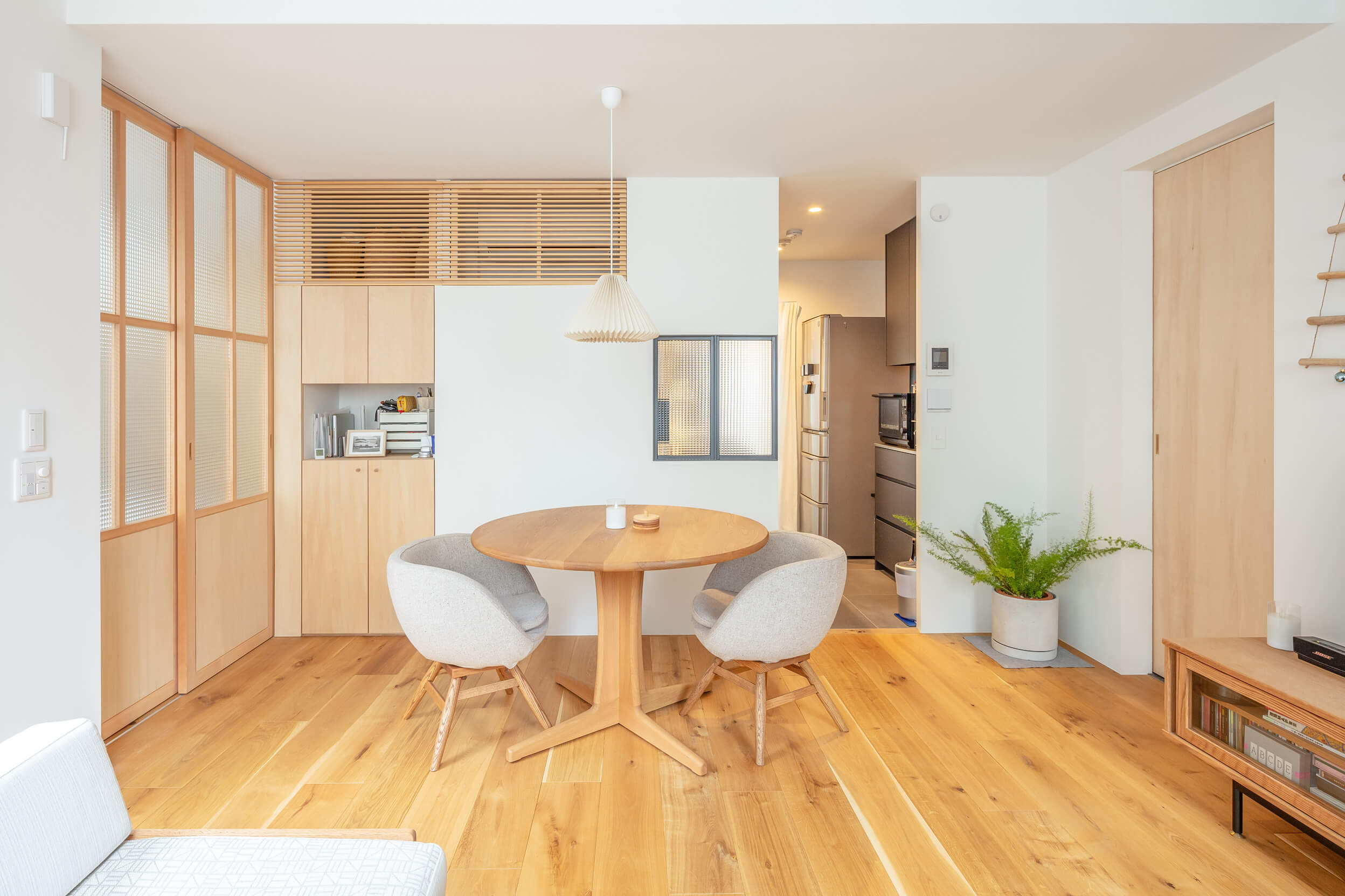 The new house is a three-storey, two-family house, with separate households on the first, second and third floors. The front road is only about 2m wide, so the site area was reduced as a setback. The second floor has a large opening to a vacant lot on the south side, again allowing light and wind to enter the rooms from there. The external walls are made of galvalume corrugated sheet, which is easy to maintain, and the colour is wine red, which is in keeping with the nostalgic atmosphere of the town. The interior is decorated in the owner's favourite natural modern style, creating a cosy space. The house is certified as a long-term quality house with high airtightness and thermal insulation.
