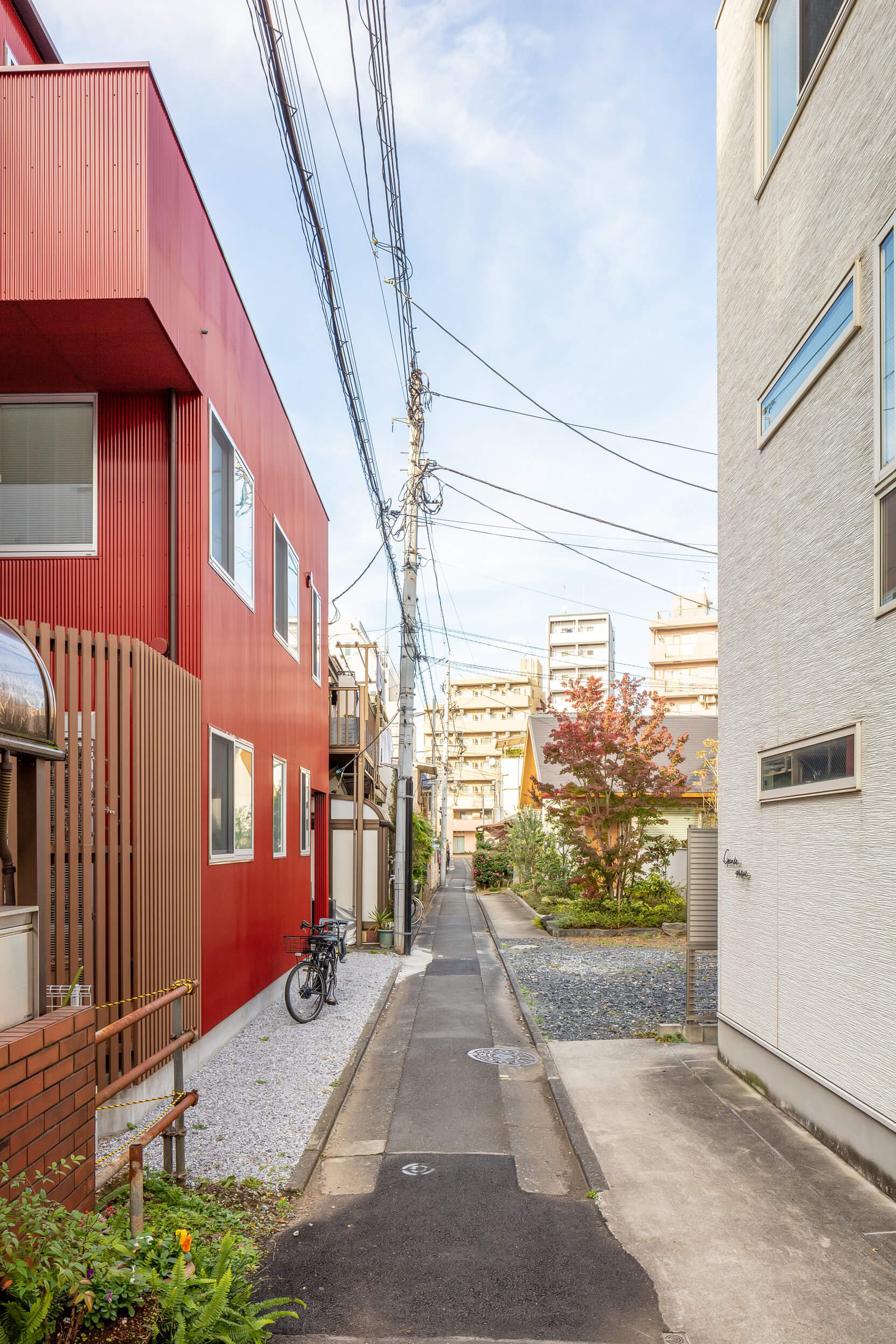 新しい家は3階建ての2世帯住宅とし、1階と2―3階で世帯を分けた。前面道路の幅は約2Mと細かったため、セットバックとして敷地面積が削られるという厳しい条件の中、どうすれば、居心地の良い住居環境が獲得できるかを考え、1階の南東のコーナーを少し削り、デッキテラスを配置し、そこから光と風が部屋中に入り込むようにした。2階は南側にある空地に向けて大きく開口を設け、やはり、そこから光と風が部屋中に入り込むようにしている。外壁は今後のメンテナンスが容易なガルバリウムの波板を採用し、色はどこか懐かしい雰囲気のあるこの街に呼応するのではとワインレッドに決まった。インテリアはオーナーの好みのナチュラルモダンにまとめられ、居心地の良い空間となっている。この住宅は高気密高断熱の長期優良住宅としても認定された。