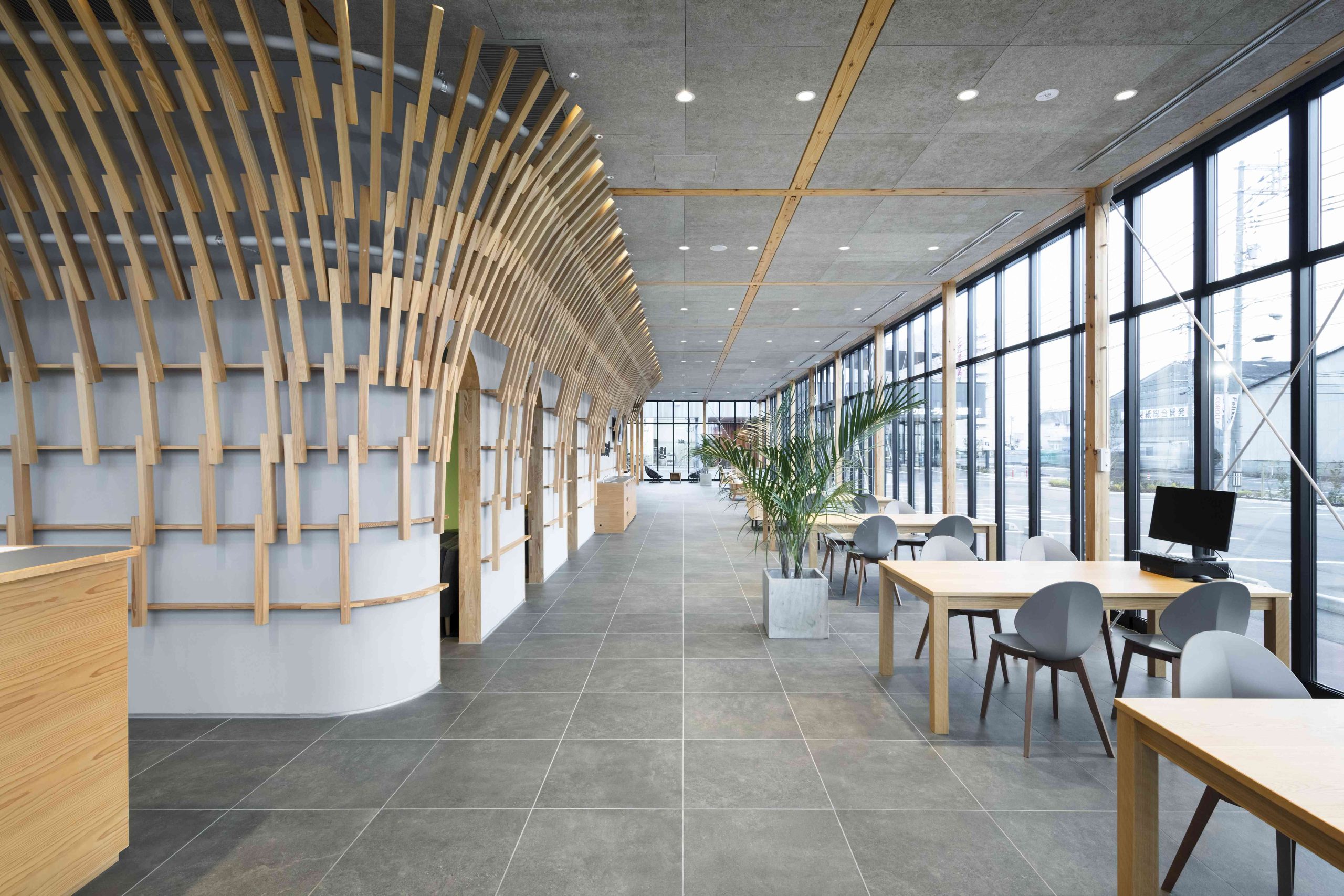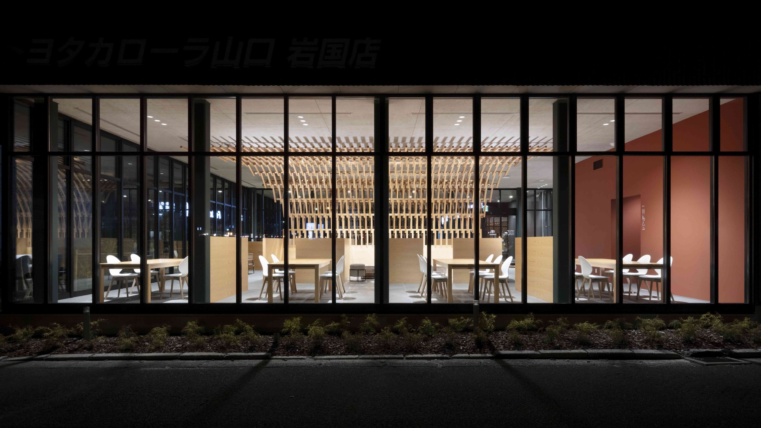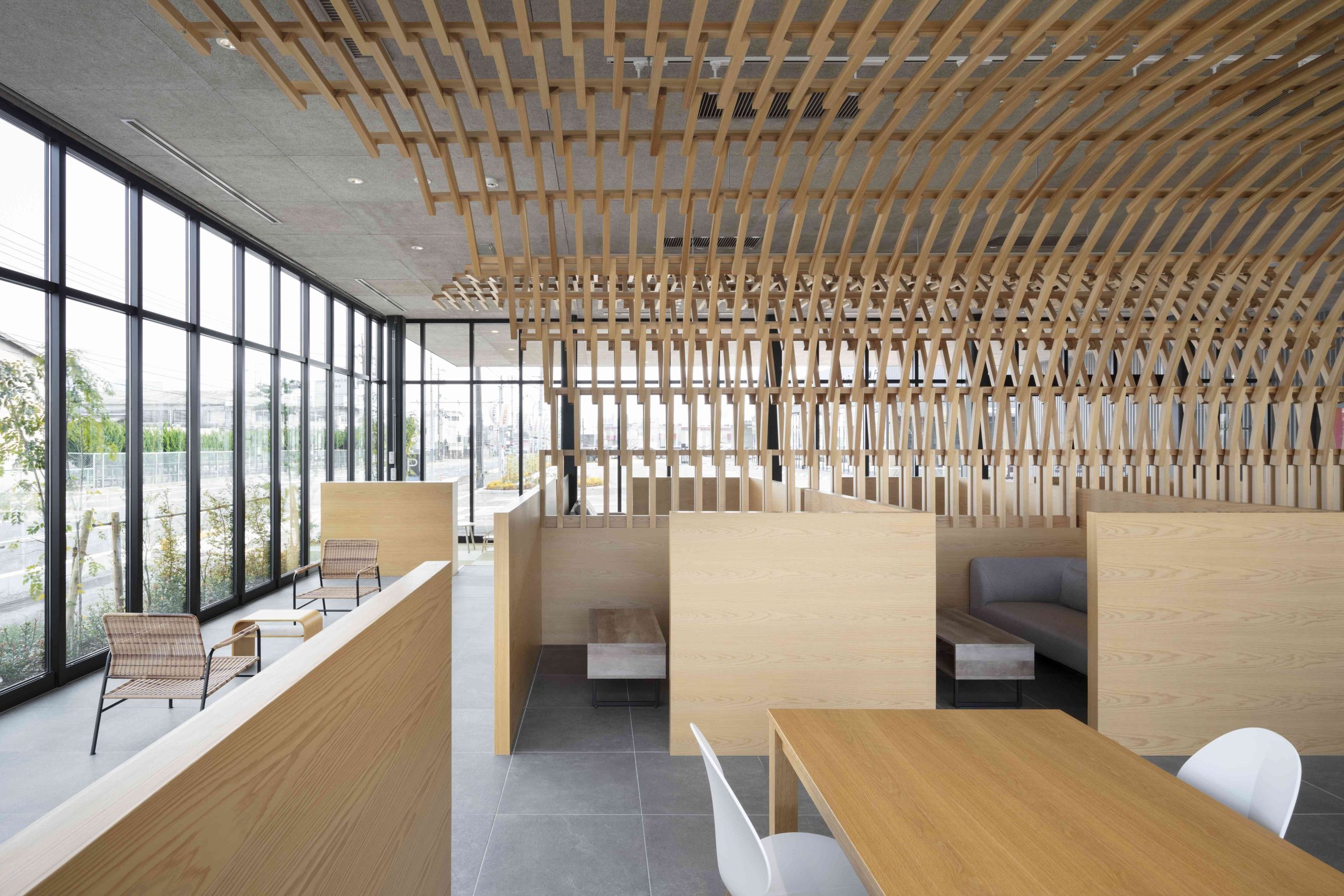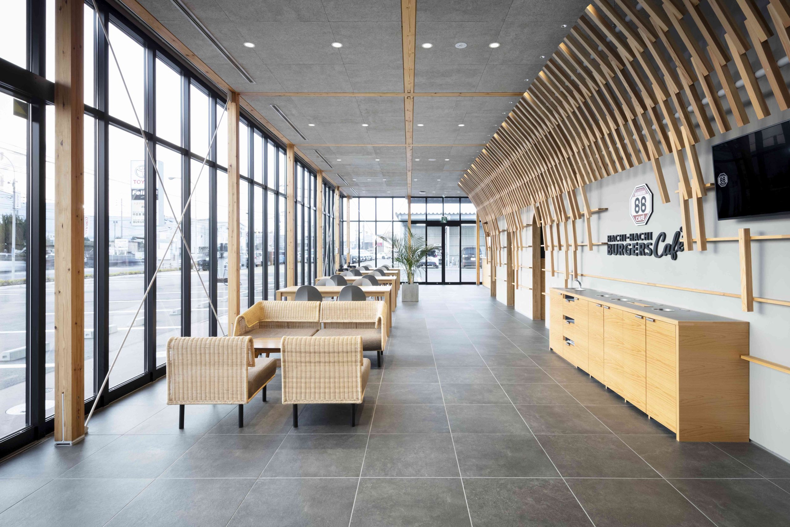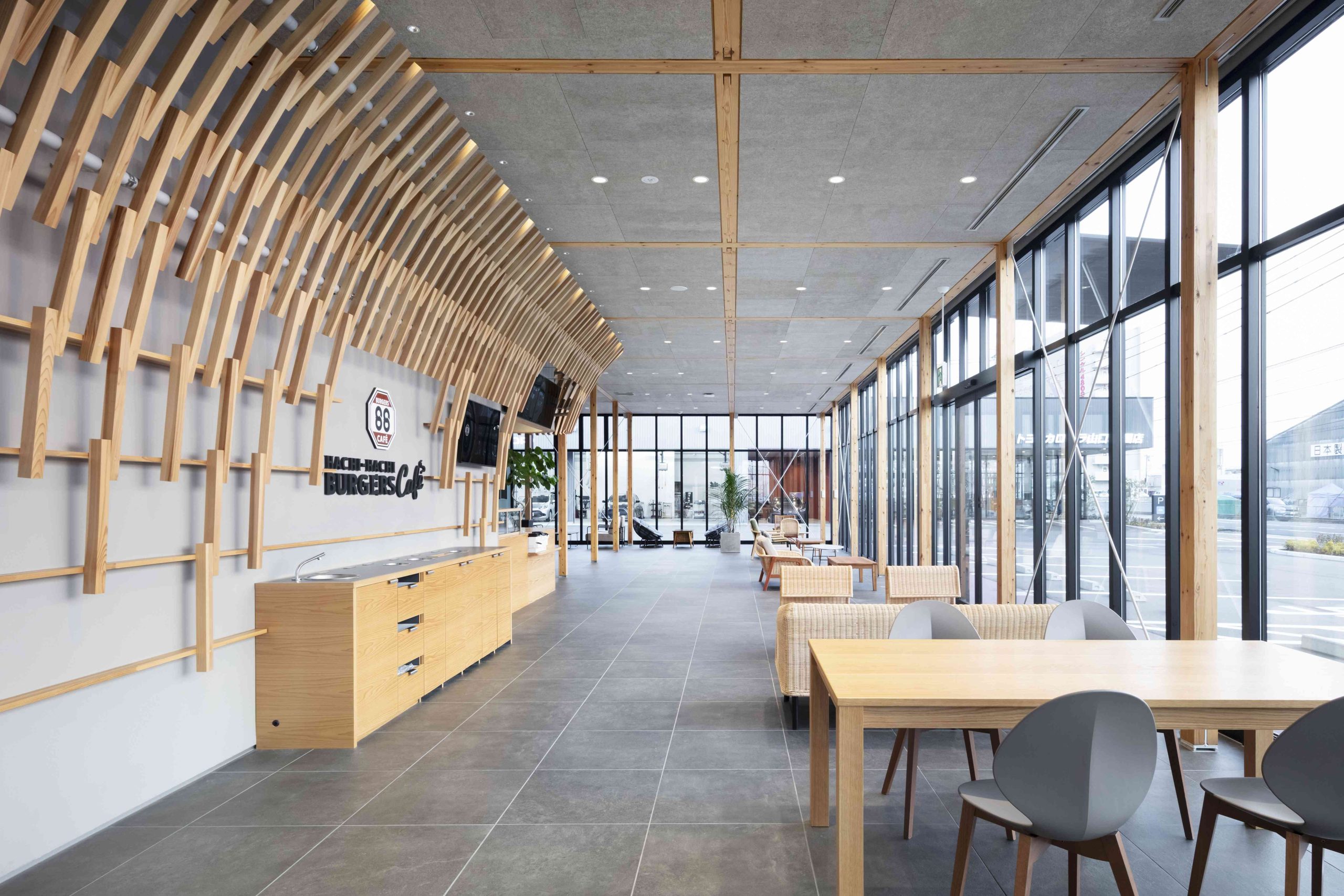 This is a complex planned for Iwakuni City, Yamaguchi Prefecture, including a car dealership and a burger shop. There is also a US military base in Iwakuni, and we thought that this facility would be visited by many foreigners, so we wanted to pay homage to the wooden bridge, Kintaikyo Bridge, which is the pride of this area. Kintaikyo Bridge is characterized by its structural form made of small pieces of wood. Therefore, the burger shop building, where fire regulations are not as strict, has a wooden structure, and in the center of the room, a combination of small pieces of wood like Kintaikyo Bridge is used to connect the walls and ceiling. This not only serves as a distinctive interior, but also as a reinforcing material. On the other hand, although the car dealership building is made of steel, we designed a wing-like framework on the ceiling that opens outward from the center of the lounge by connecting small pieces of wood. The area below is a booth waiting for maintenance, and is a calm space surrounded by wings. We hope that people who visit here will be reminded of Kintaikyo Bridge, which is located a little distance from this place, and share the greatness of Iwakuni.