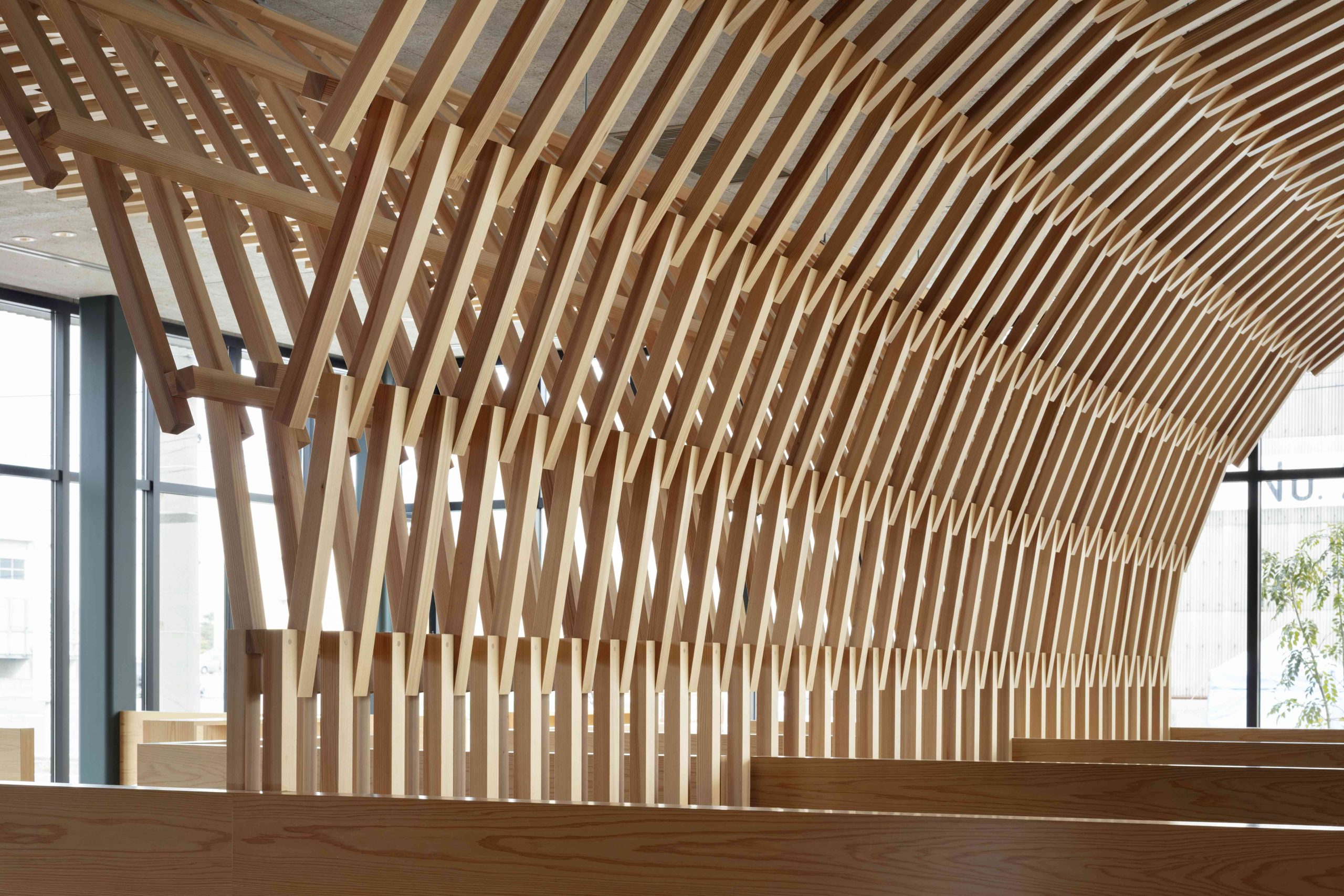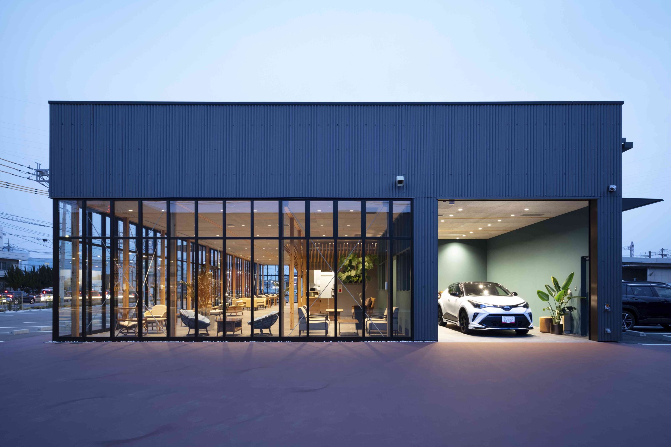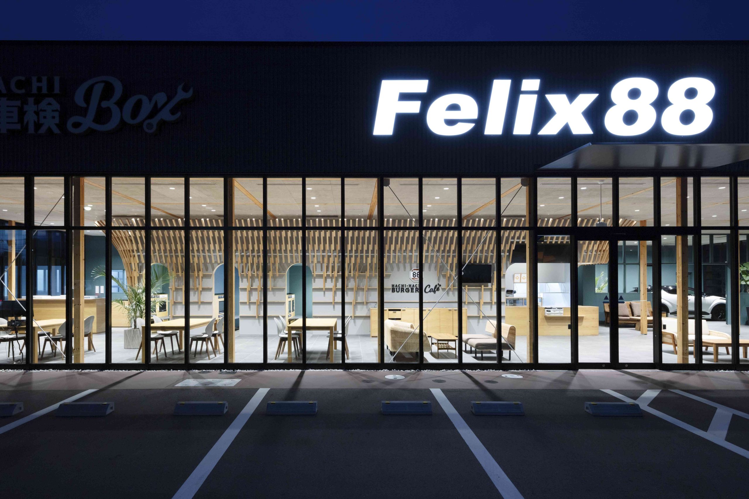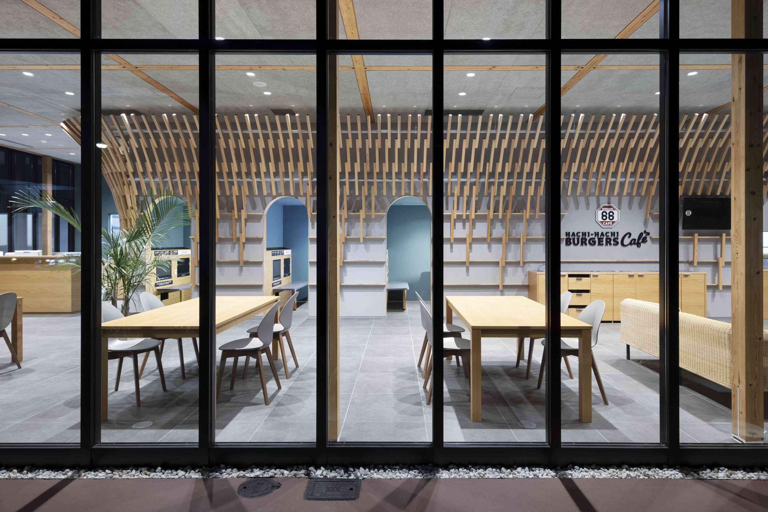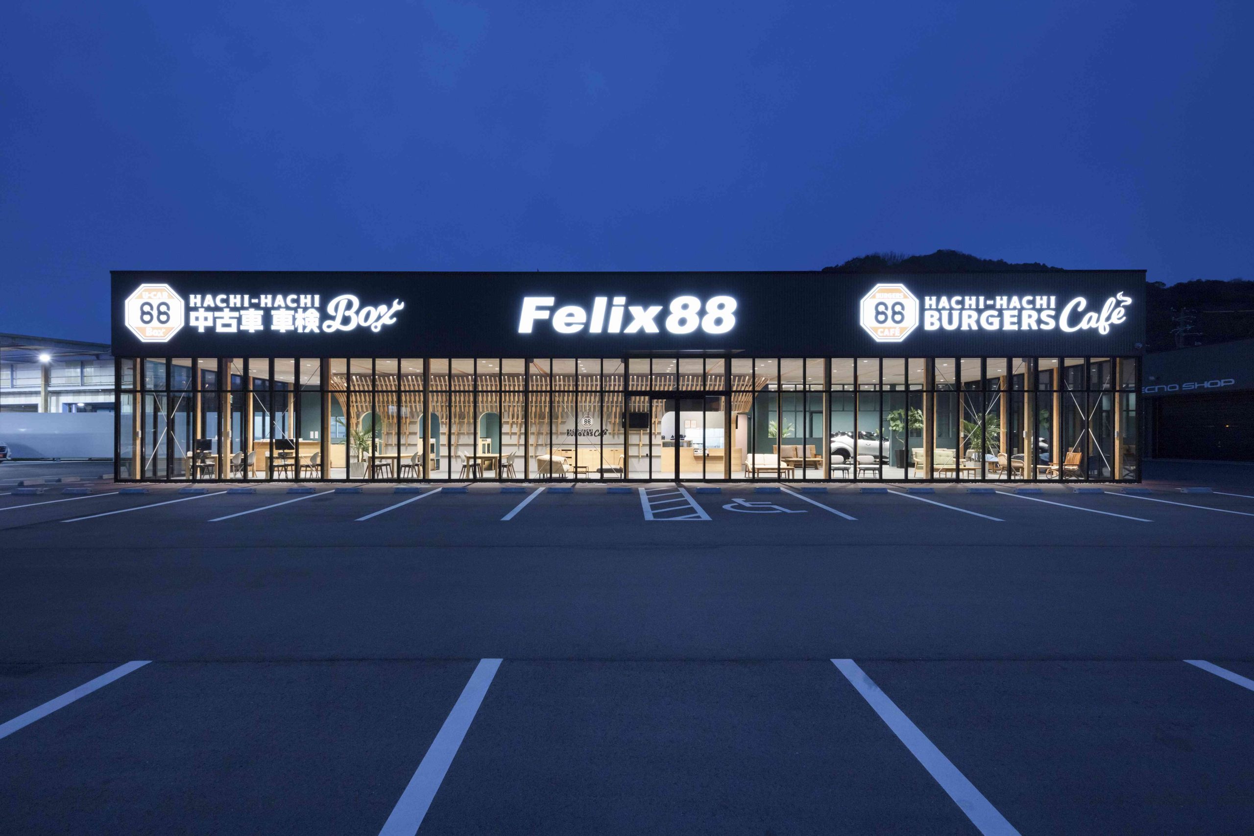 This is a complex planned for Iwakuni City, Yamaguchi Prefecture, including a car dealership and a burger shop. There is also a US military base in Iwakuni, and we thought that this facility would be visited by many foreigners, so we wanted to pay homage to the wooden bridge, Kintaikyo Bridge, which is the pride of this area. Kintaikyo Bridge is characterized by its structural form made of small pieces of wood. Therefore, the burger shop building, where fire regulations are not as strict, has a wooden structure, and in the center of the room, a combination of small pieces of wood like Kintaikyo Bridge is used to connect the walls and ceiling. This not only serves as a distinctive interior, but also as a reinforcing material. On the other hand, although the car dealership building is made of steel, we designed a wing-like framework on the ceiling that opens outward from the center of the lounge by connecting small pieces of wood. The area below is a booth waiting for maintenance, and is a calm space surrounded by wings. We hope that people who visit here will be reminded of Kintaikyo Bridge, which is located a little distance from this place, and share the greatness of Iwakuni.