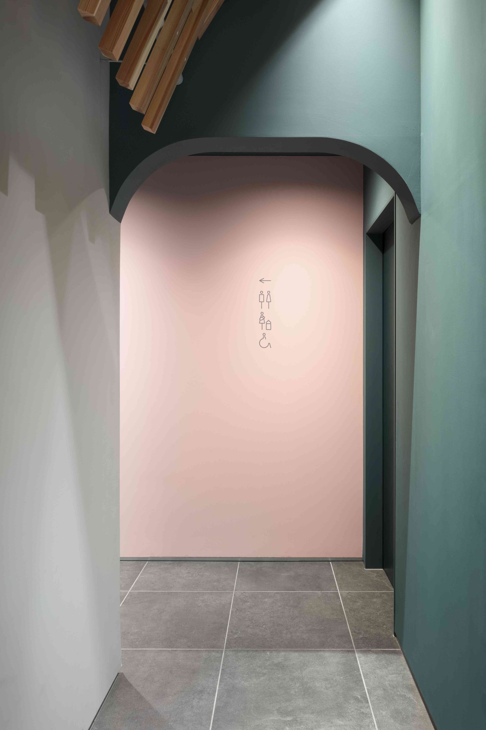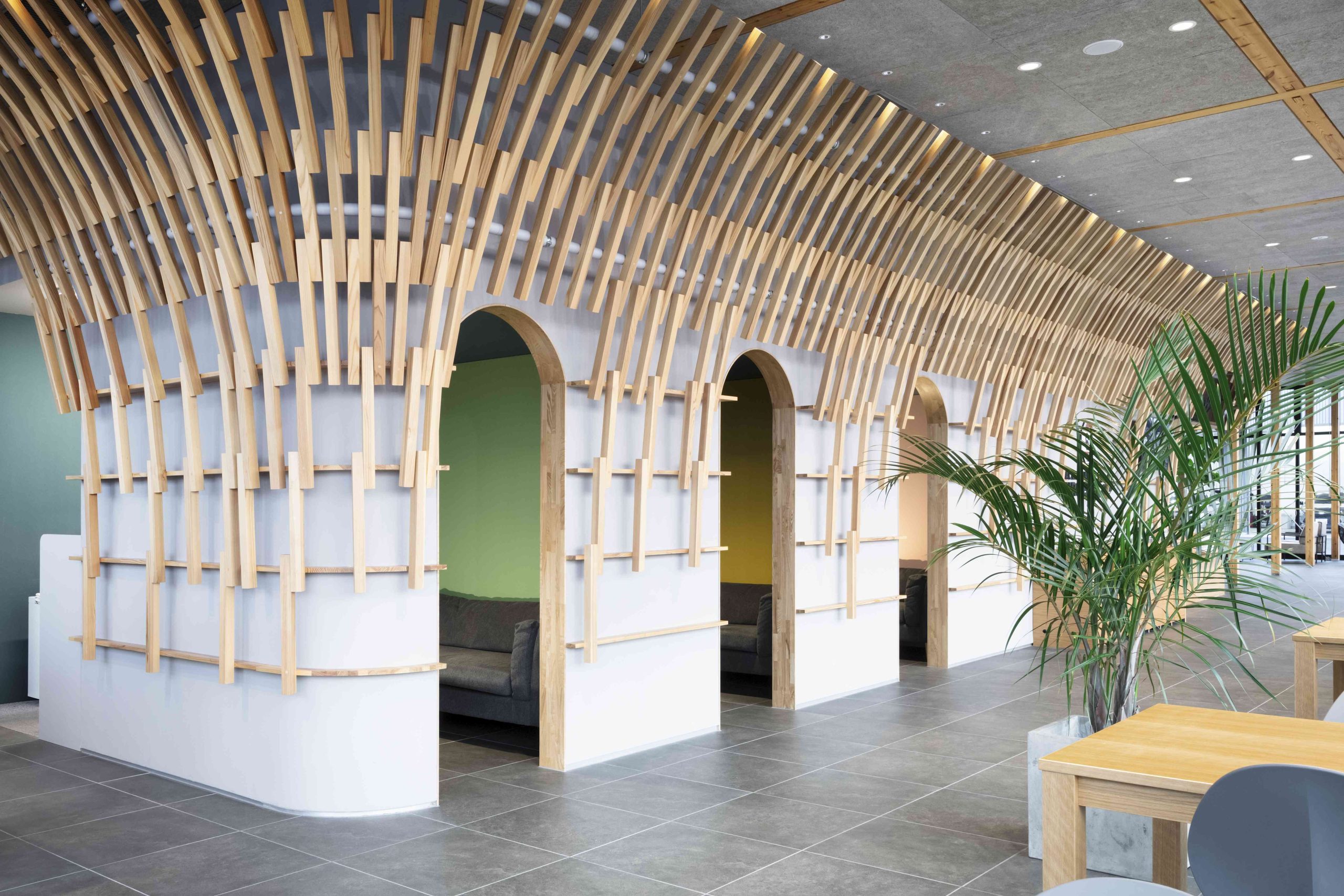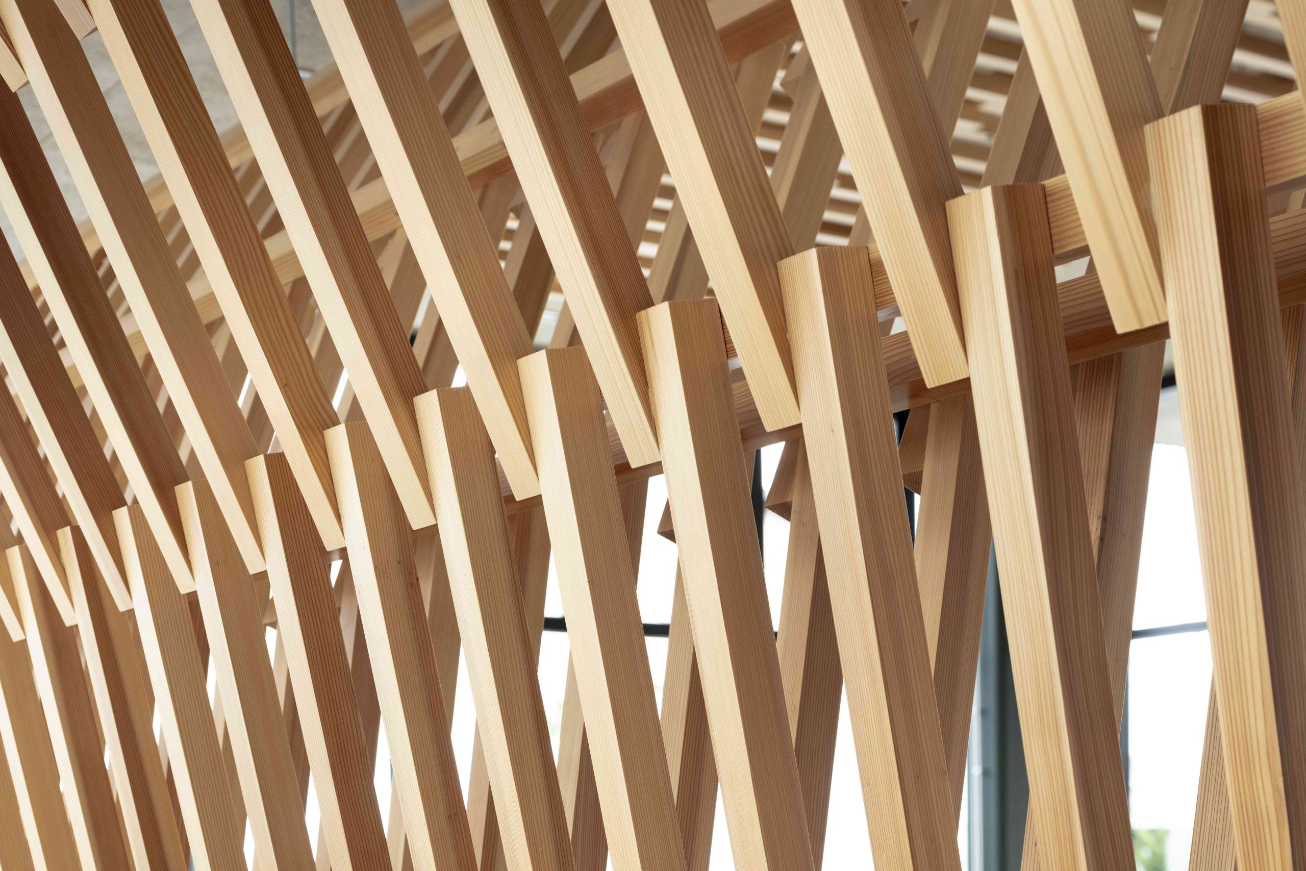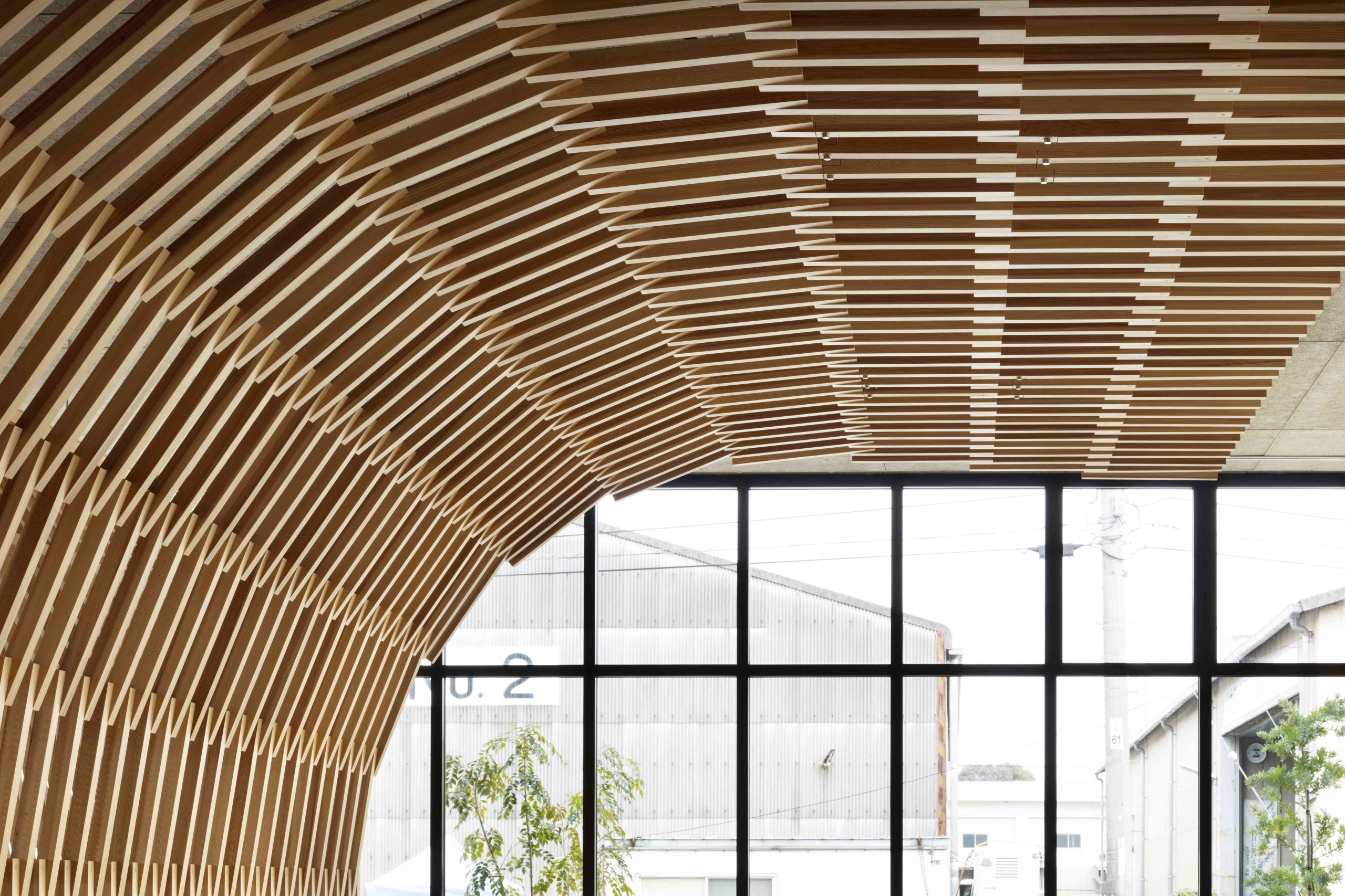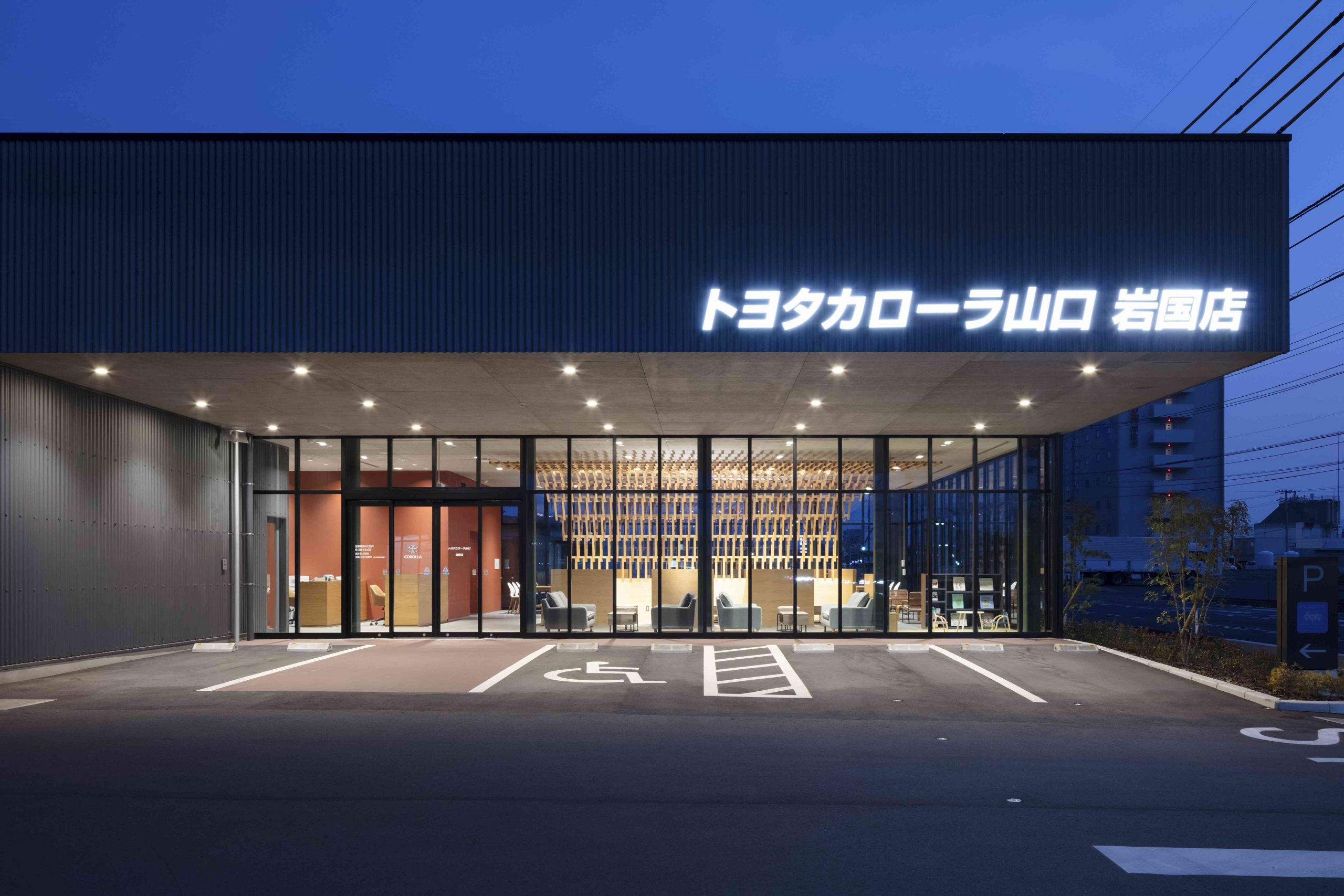 岩国には米軍基地もあり、外国人の方も多く訪れる施設になると考え、この地が誇る木造の橋、錦帯橋をオマージュしたいと考えた。錦帯橋は細かい木をつないだ構造形式が特徴である。そこで、防火規制がそこまで厳しくないバーガーショップの棟は構造を木造として、室内の中心に錦帯橋のような細かい木の組み合わせで壁と天井をつないだ。これは特徴的なインテリアとしてだけでなく、補強材としても機能している。一方、カーディーラーの棟は鉄骨造ではあるが、細かい木をつないでラウンジの中心から外側に大きく開いた翼のような骨組みを天井にデザインした。その下のエリアは整備待ちのブースとなっており、翼に包まれた落ち着いた空間となっている。ここに訪れる人々が、この場所から少し離れたところにある錦帯橋のことを少しでも思い起こしていただき、岩国のすばらしさを共有してくれたらと願う。