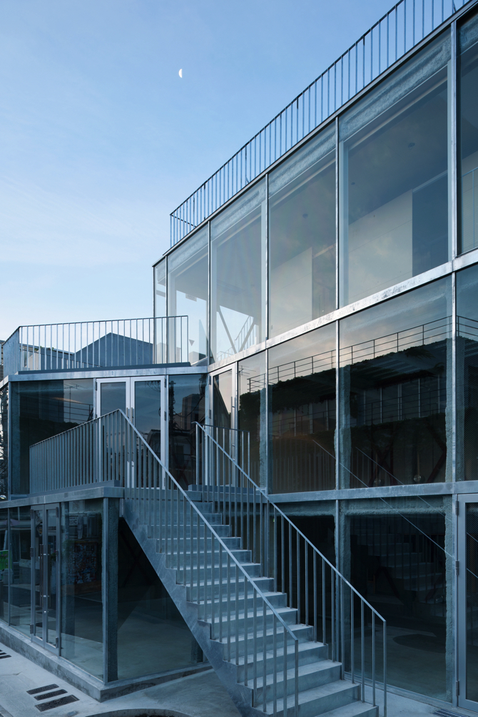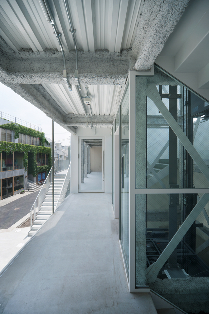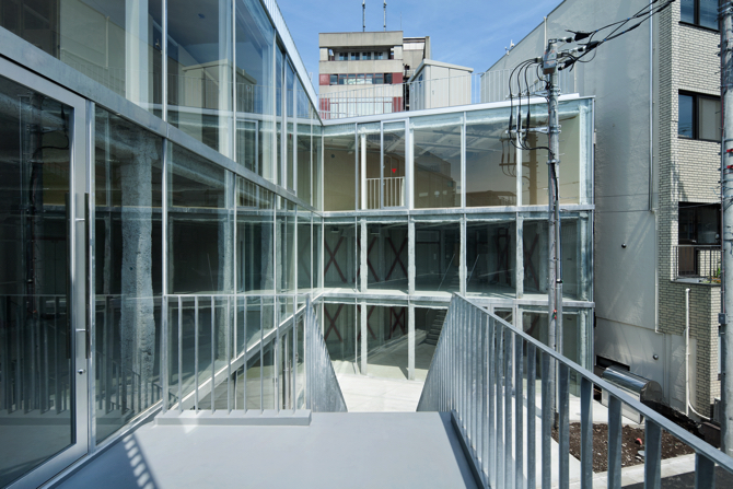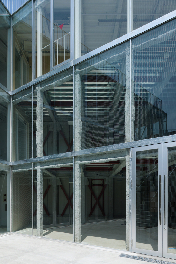 The façade facing the L-shaped alley is made of glass in order to make the indoor and outdoor activities as equivalent as possible. A simple construction is used, with a 70-thick concrete filling between the glass on the upper and lower floors and hot-dip galvanised steel plates fixed as a curtain wall. The simplest detail was chosen as a result of considering various delivery methods in the face of stricter fire regulations for curtain walls and sashes. Most of the 125 x 125 ST columns and 125 x 250 ST beams are sprayed with fireproof coating and as close to the glass as possible. The fireproofing was sprayed on most of the 125x125 ST columns and 125x250 ST beams. This is of course to maximise the effective area of the shop while using inexpensive materials and fireproof specifications, but it is also in the hope that the dissonance created by the proximity between the ‘roughness’ of the fireproof cladding and the ‘smoothness’ of the glass will give the building and the shops within it a factory-like character. The building is a factory.