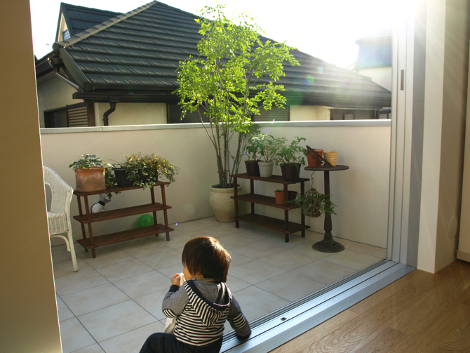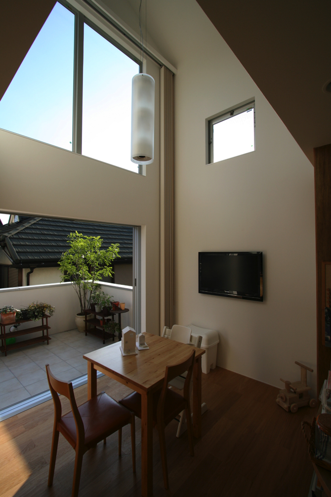 The house was planned in a quiet residential area in Tokyo. The LDK is about 12 tatami mats including the kitchen, but the terrace is more than 8 tatami mats in size. The LDK also has a stairwell, which can be fully opened to the terrace using retractable sashes. This allows the LDK to become one with the terrace, giving a sense of spaciousness. The wiring for the TV hanging on the wall is concealed inside the wall to make the living room look neat and not feel cramped. The handrail wall on the terrace is high enough to hide the opening to the neighbouring house, so that the roof terrace can be used as a private space like the living room.