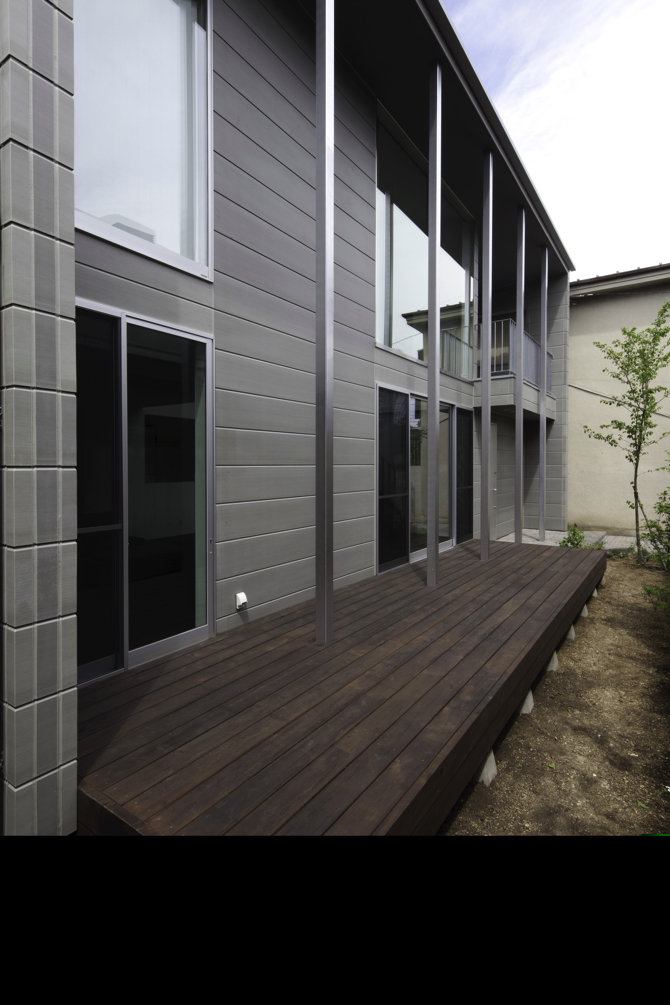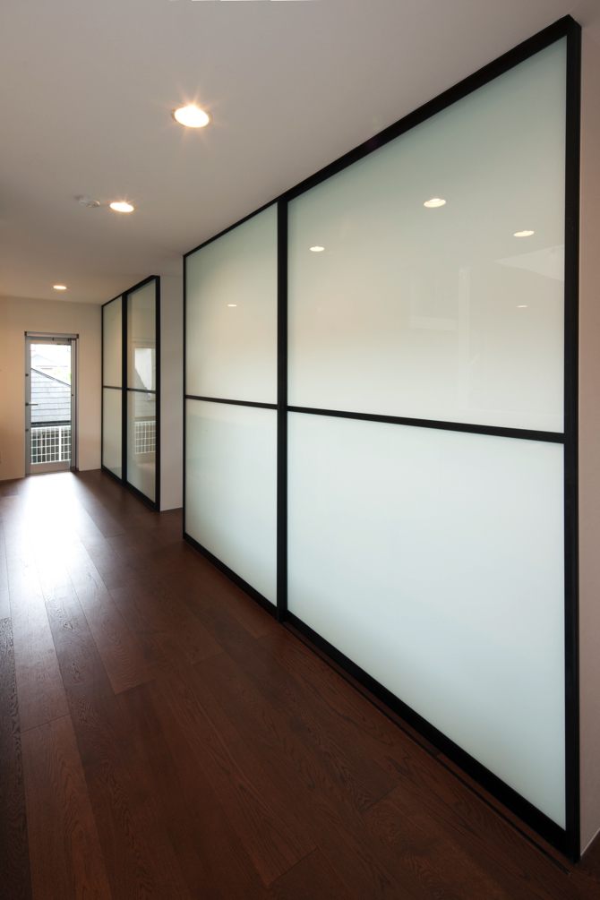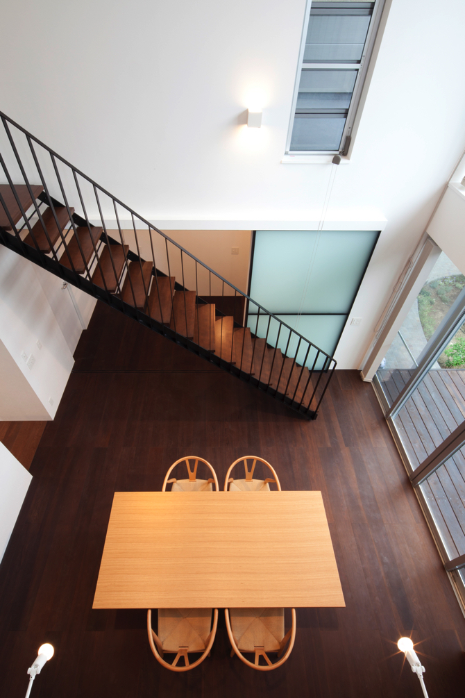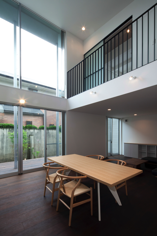 東京武蔵野の落ち着いた住宅街に計画された住宅である。冬暖かく、夏涼しい家、耐久性のある家、庭と一体になるシンプルな家、を希望された。そこで、外壁、屋根とも外断熱にして大きな吹き抜けがある中で、家全体として住環境を高めることを検討した。外壁は耐候性のある中空セメント板で仕上げ、耐久性を高め、空間内部は落ち着いた色を基調として、ポイントとして乳白ガラスの引き戸を使用している。また、鉄骨階段の段と段の間の隙間には丸棒を設置し、お子さんが安心して上れるように工夫をした。