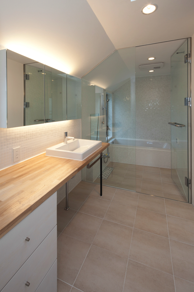 The house was planned in a calm residential area in Musashino, Tokyo. The client wanted a house that is warm in winter and cool in summer, a durable house and a simple house that integrates with the garden. Therefore, the house as a whole was considered to enhance the living environment, with both the exterior walls and roof insulated externally and a large atrium. The exterior walls are finished with weather-resistant hollow cement boards to increase durability, while the inside of the space is based on a subdued colour scheme, with milky white glass sliding doors as a point of reference. In addition, round bars were installed in the gaps between the steps of the steel-framed staircase to ensure that children can safely climb up the stairs.