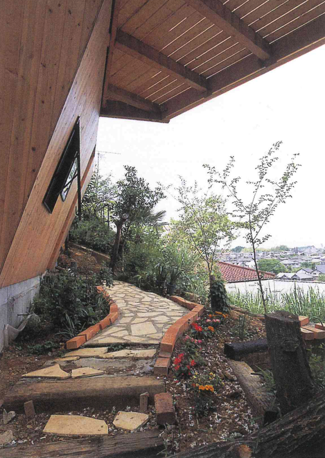 The housing is planned in a suburb about 30 minutes by train from the city centre. The site of this housing is a very special case in that the building site can only be reached by climbing a 30 m slope from the road. The elevation is quite high even at the front road level, so the building site is literally like the ‘top of a mountain’. From the initial planning stage, the project was extremely difficult due to the problem of how to bring in materials to a site with these conditions and the fact that the area that could be structurally built on was very small when stable ground was taken into account. As a result, the first floor was planned with a small area for the small stable ground, and the second and higher floors were expanded into a barrel shape to increase the area, thereby securing the living space and making the shape structurally stable. The building is basically constructed of wood, but reinforced concrete is used only where it is structurally necessary to minimise the weight of the building as a whole, and the plan does not require piles or other ground improvement. A light spiral staircase made of wood is placed in the centre of the barrel-shaped shape, and an Arrow fan is also installed in one part of the building to circulate the air. This fan sends cool air from the lower floor to the upper floor during the hot summer months and warm air from the upper floor to the lower floor during the cold winter months. Despite its location not far from the city centre, the building is still filled with the sounds of warblers in spring and raccoon dogs can be seen in summer. There is still abundant greenery around the building, and the owners are enjoying the unique lifestyle of this location by growing shiitake mushrooms and creating walking paths