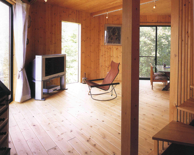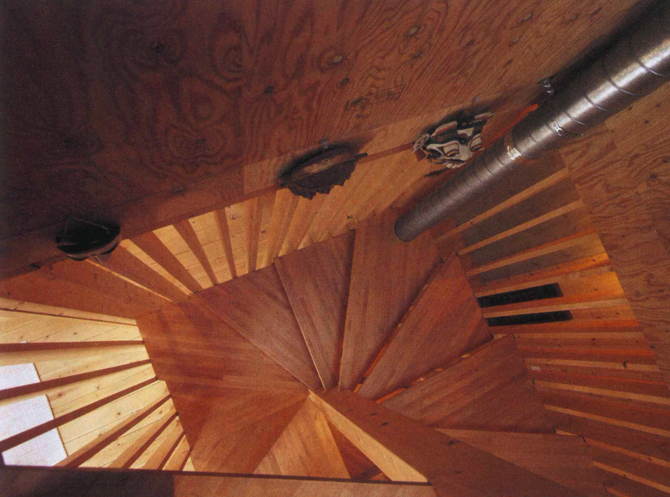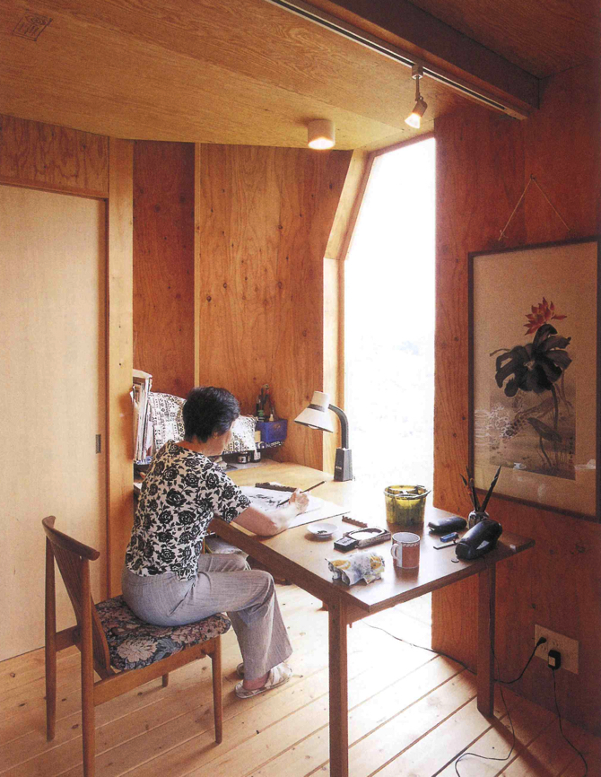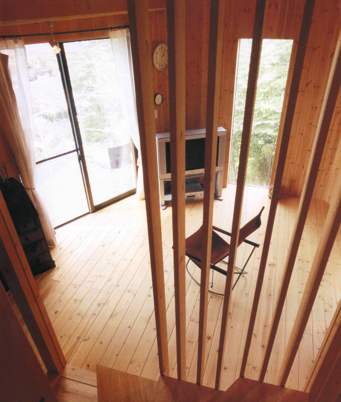 都心から電車で30分ぐらいの郊外に計画された住宅。この住宅の敷地は建物が建てられる場所が道路から30mほどの坂を登ってようやくたどり着けるという非常に特殊なケースである。前面道路の段階でもかなり標高は高いので、建物が建つ場所は文字通り「お山のてっぺん」のようなところだ。計画初期段階から、この条件の土地にどうやって資材を搬入するか、また、安定地盤を考慮すると構造的に建てられる範囲が非常に小さくなるという問題もあり難航を極めた。結果的に小さな安定地盤に対して1階を小さな面積で計画し、2階以上を樽型に膨らませ面積を大きくすることで、居住空間を確保し、かつ構造的にも安定した形状となるようにした。基本的には木造であるが、構造的に最小限必要な場所のみ鉄筋コンクリート造にして、建物全体の重量をなるべく大きくしないように注意しながら、杭等の地盤改良を必要としない計画を実現している。樽型の形状の中心部に木で製作された軽やかな螺旋階段が配置され、また、その一部に空気を循環させるアローファンも設置した。このファンは夏の暑いときは下階の涼しい空気を上階に送り、冬の寒いときには上階の暖かい空気を下階に送ることができる。都心からそれほど離れていない場所にも関わらず、春はウグイスの鳴き声が響き渡り、夏には狸に会うこともあるという。まだまだ建物の周りには豊かな緑があり、椎茸を栽培したり、散策路を作ったりとオーナーはこの場所ならではの生活を満喫されている