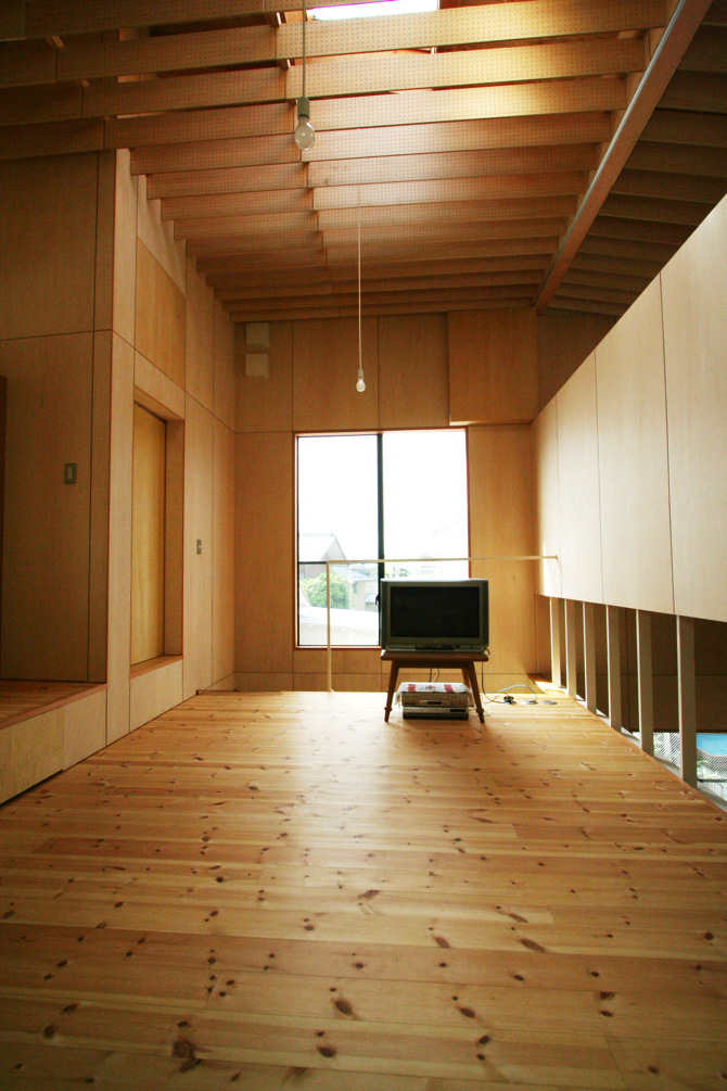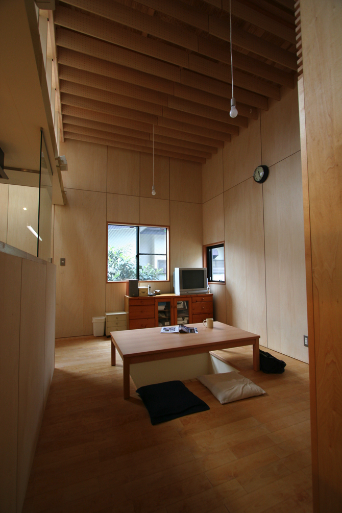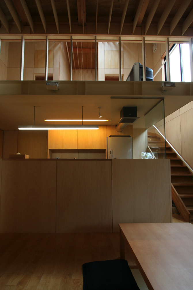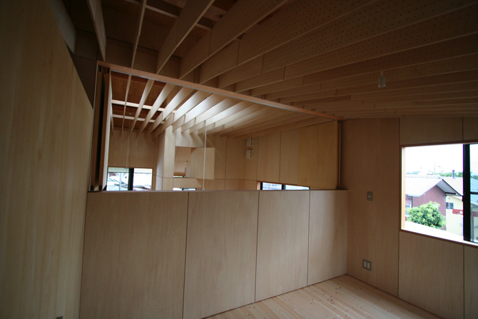屋根と外壁は紺色のガルバリウム鋼板で多い、外部のメンテナンスがあまりかからないようにした。一方、インテリアはシナ合板を主な素材として活用している。内部は外観では感じさせないぐらい複雑な立体で構成とし、オーストリアの建築家、アドルフ・ロースが提唱した「ラウムプラン」を目指している。その結果、豊かな空間体験と素材を楽しめる住宅となっている。