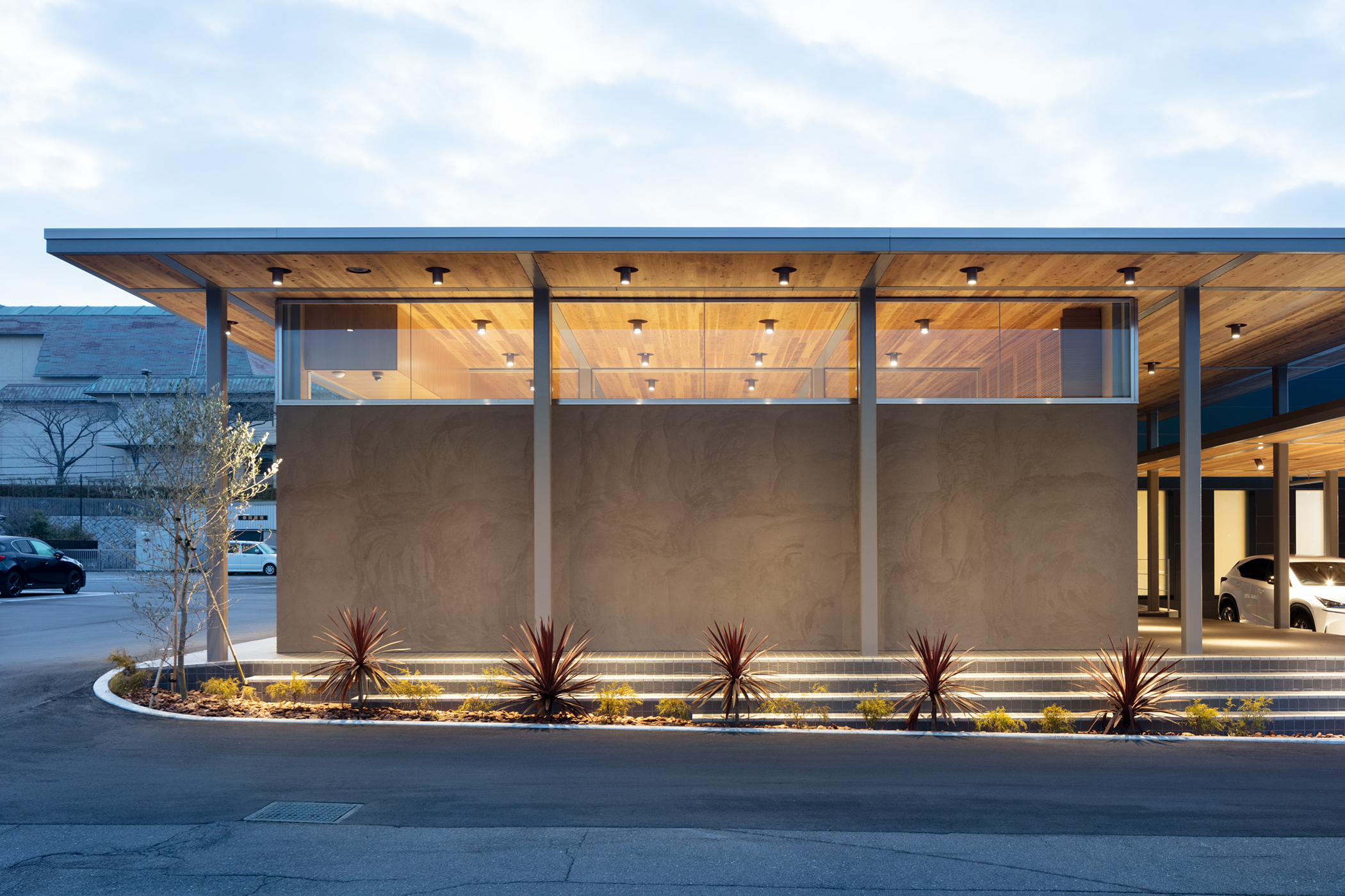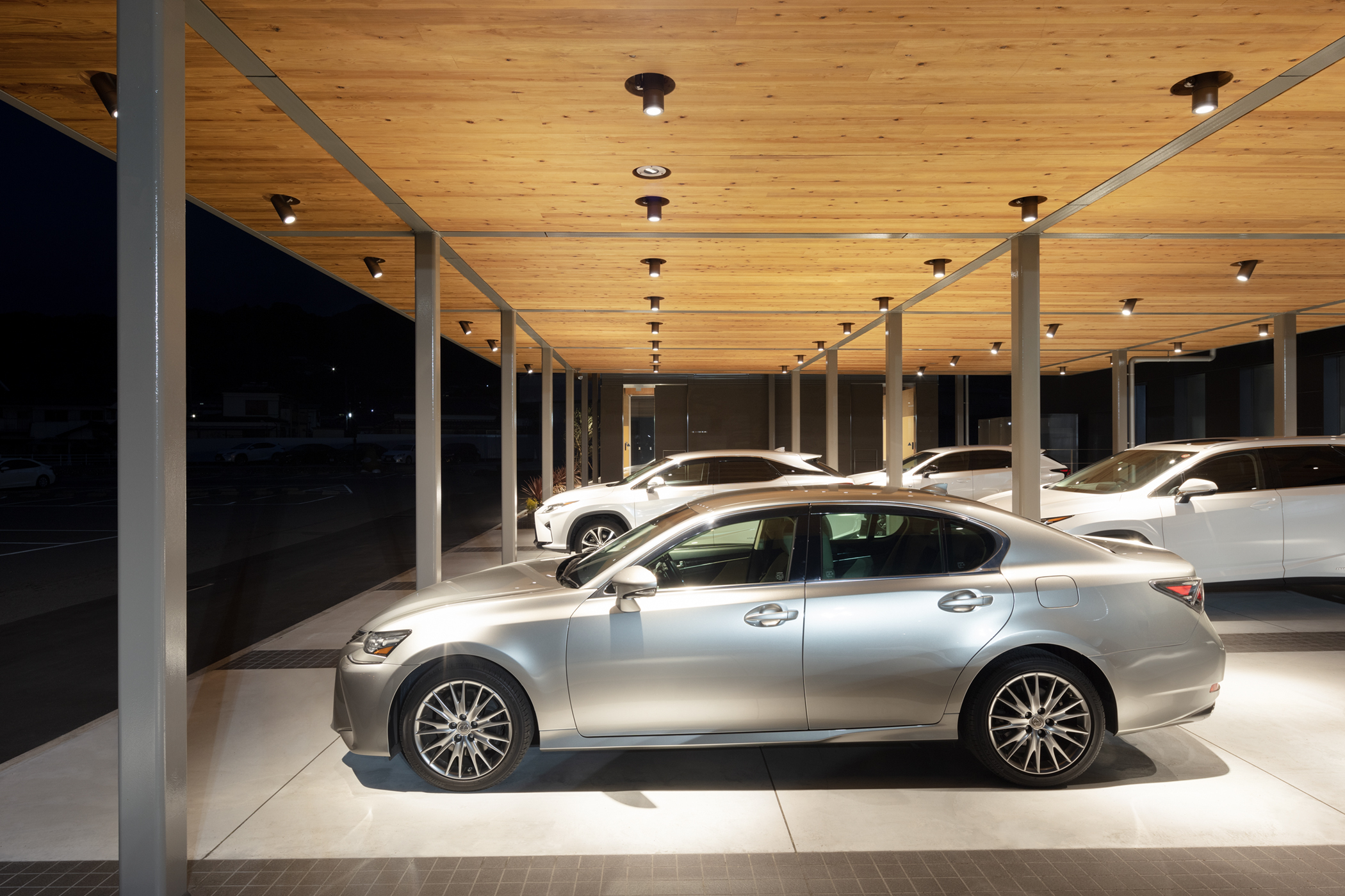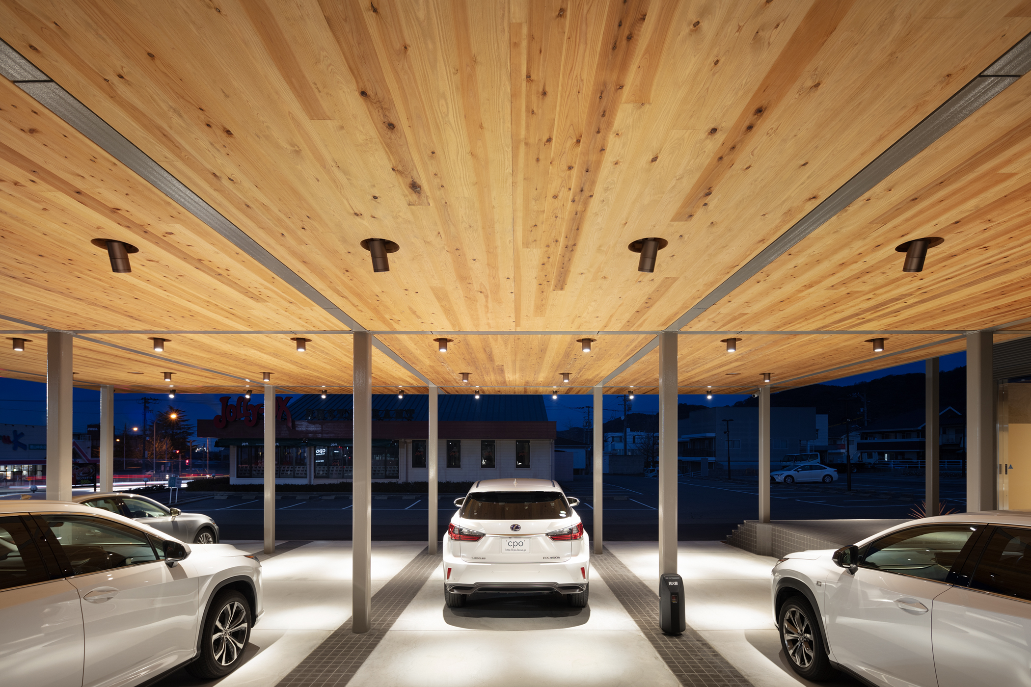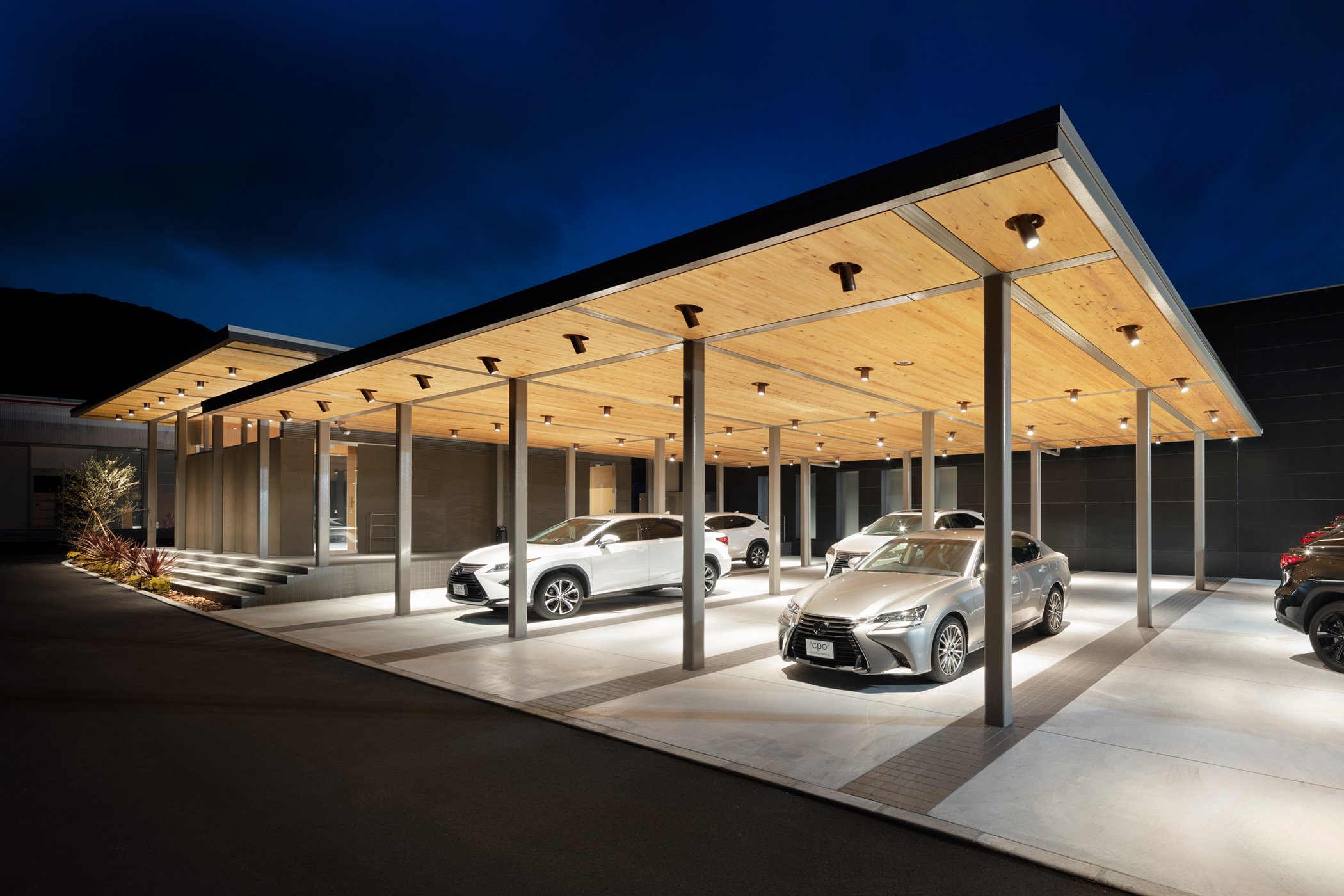 道路から穏やかな勾配で上がっている敷地に呼応するように2枚の屋根を、段々状に重ねたシンプルな計画とした。道路から見えやすい手前のスペースをCPOの展示スペースとし、道路から奥に上がったところを納車スペースとしている。構造は鉄骨のラーメン構造のフレームで組み、屋根の構造はCLTを採用した。CLTは山口のお隣の岡山のCLT工場で製作され、運びこまれた。屋根のグリット状の梁はカットTで出来ており、そこに、工場であらかじめ溝が彫られ不燃処理されたCLTを、上から落とし込むという単純な工法により、工期が短縮されるだけでなく、CLT構造そのものが天井の仕上げとすることができた。