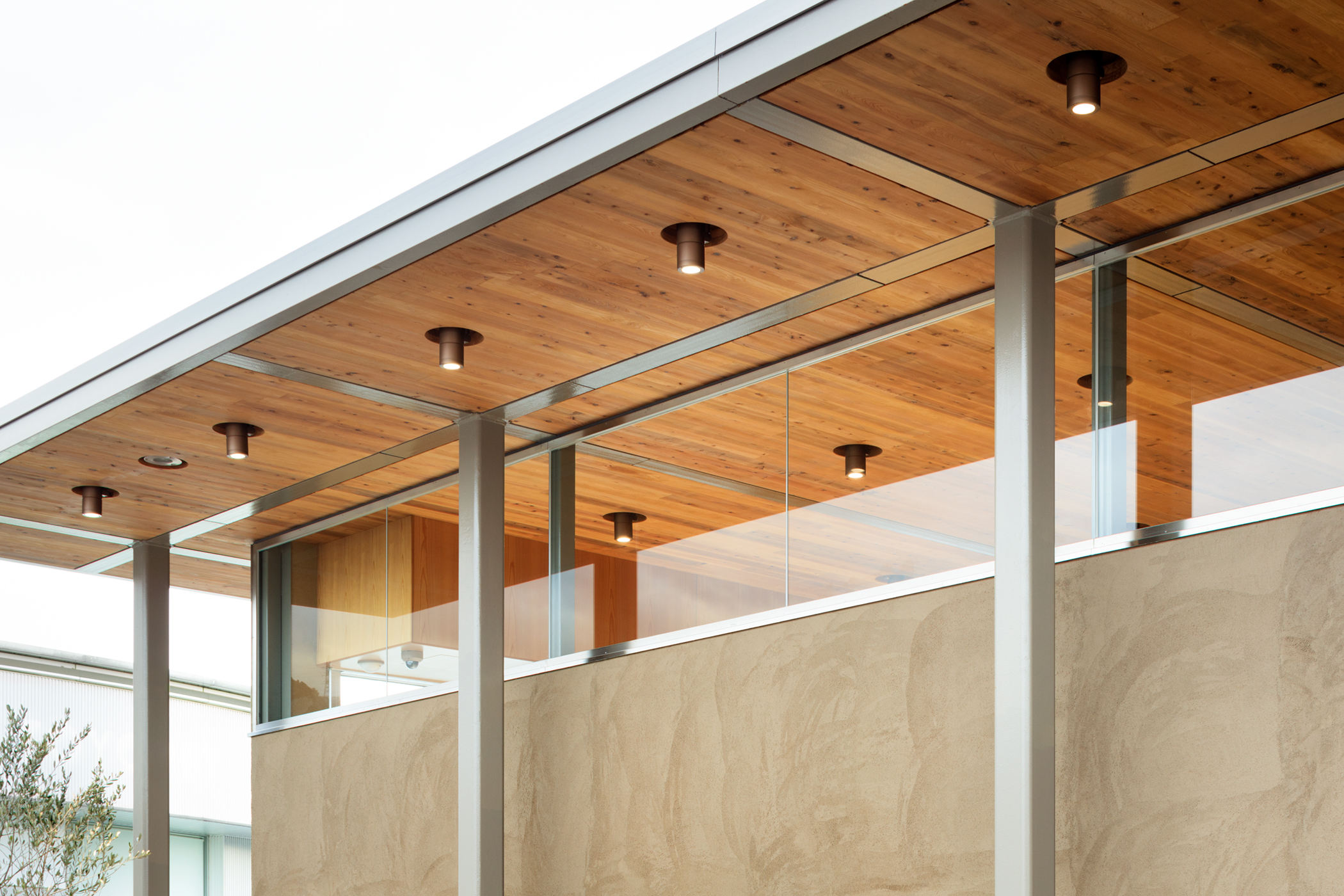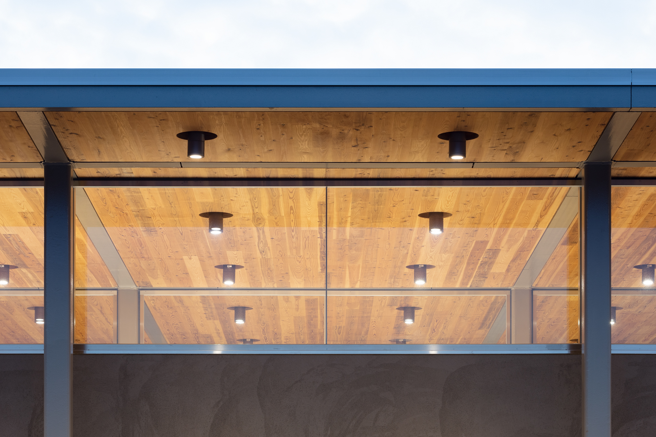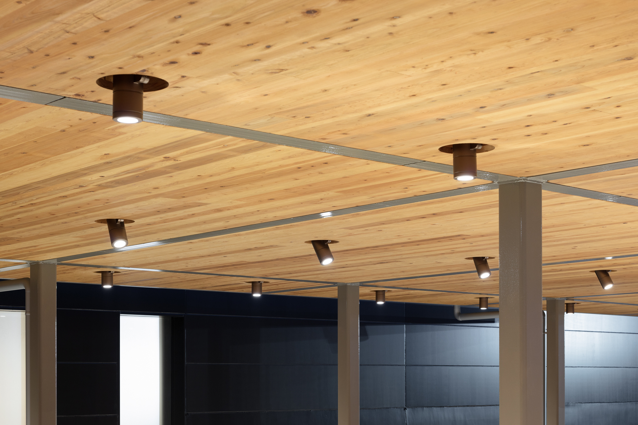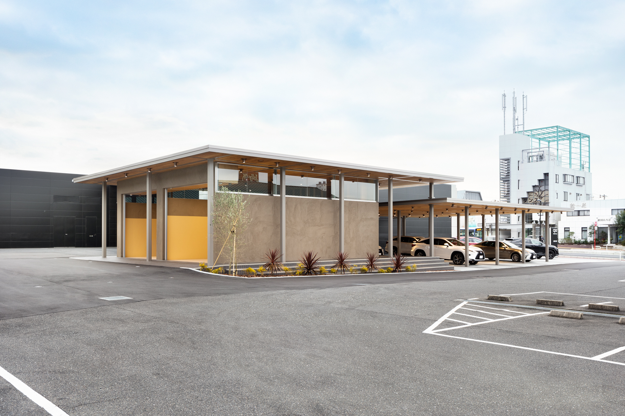 道路から穏やかな勾配で上がっている敷地に呼応するように2枚の屋根を、段々状に重ねたシンプルな計画とした。道路から見えやすい手前のスペースをCPOの展示スペースとし、道路から奥に上がったところを納車スペースとしている。構造は鉄骨のラーメン構造のフレームで組み、屋根の構造はCLTを採用した。CLTは山口のお隣の岡山のCLT工場で製作され、運びこまれた。屋根のグリット状の梁はカットTで出来ており、そこに、工場であらかじめ溝が彫られ不燃処理されたCLTを、上から落とし込むという単純な工法により、工期が短縮されるだけでなく、CLT構造そのものが天井の仕上げとすることができた。