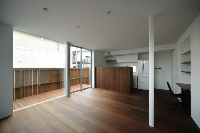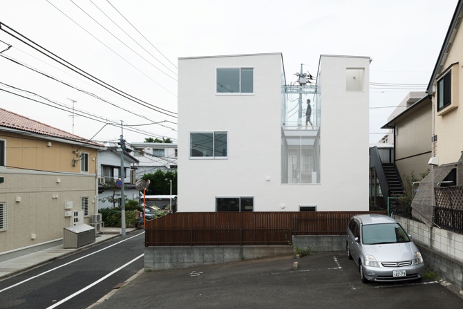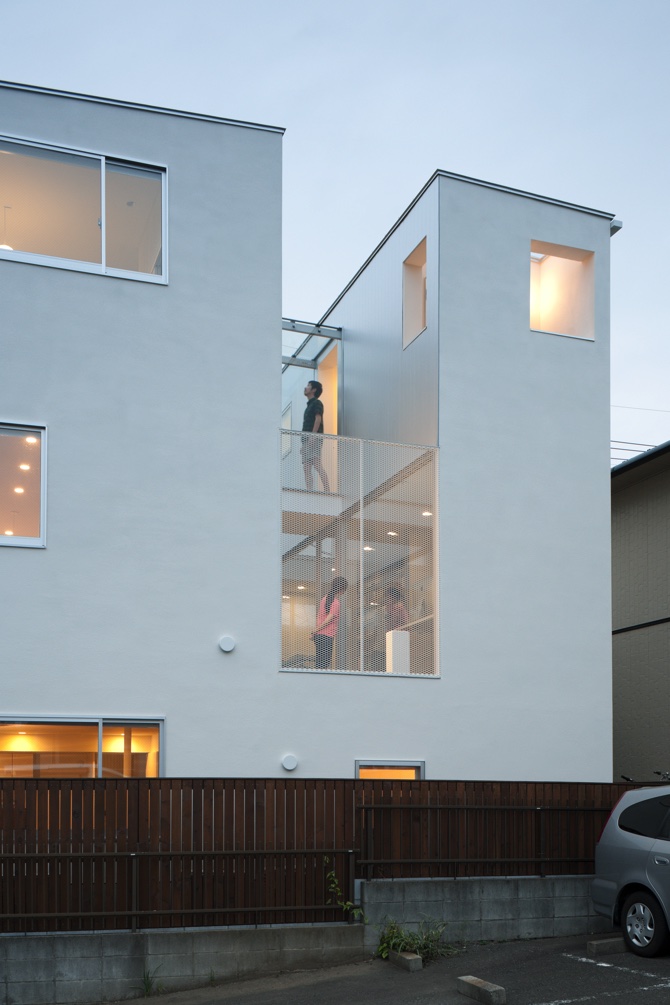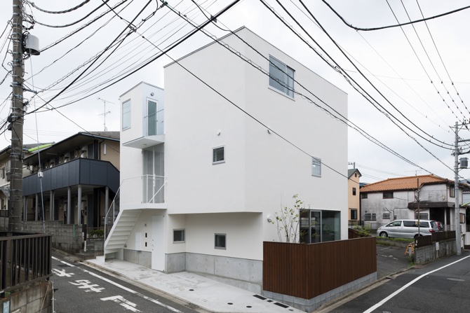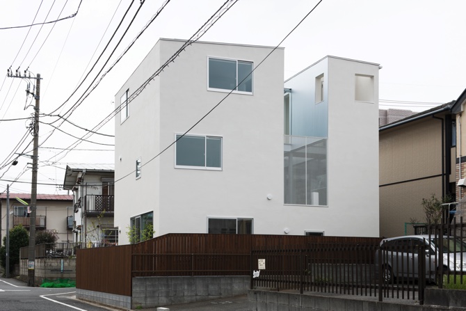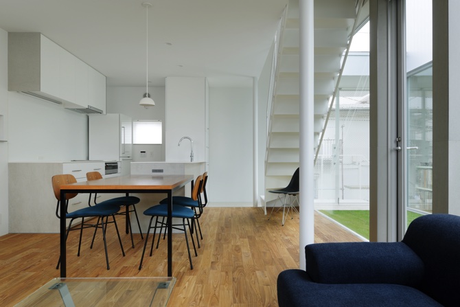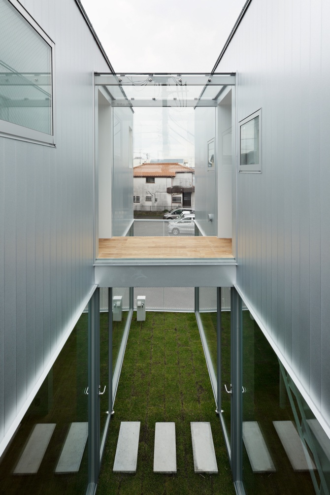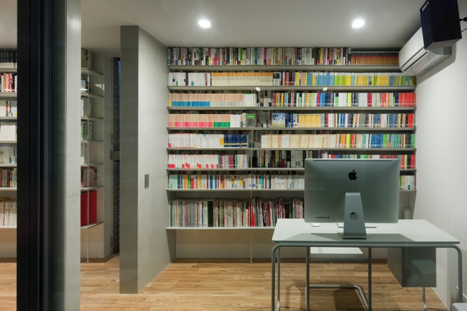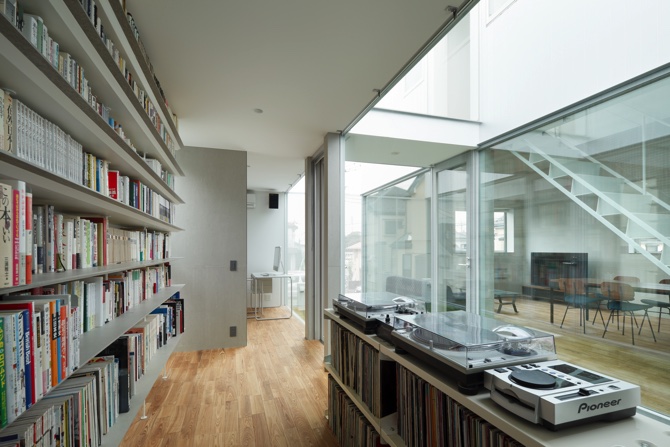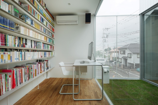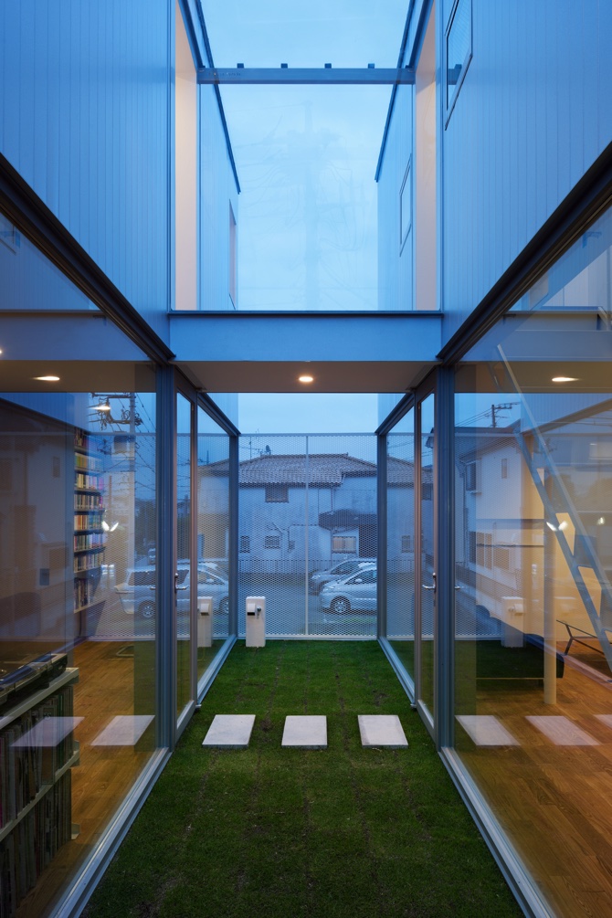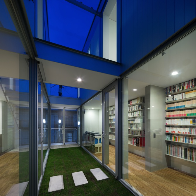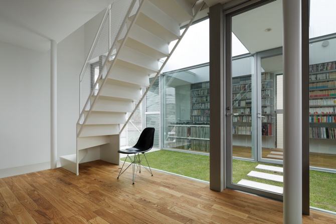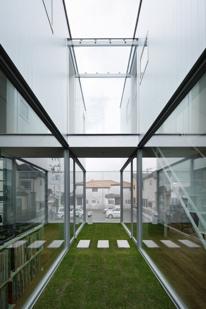 クライアントのご夫婦とは土地探しからご一緒させていただいた。そして、運良く綺麗な立方体の3階建てが建てられる土地が見つかり計画がスタートした。ここでは2世帯の繋がり方をデザインしようと考えた。両世帯は常に分断されるべきではないが、とはいえ、両世帯が常に接続の状態というのもお互い疲れてしまう。そこで、1階は親世帯、2階、3階は子世帯という構成を基本としながら、2世帯の共有スペースとして建物の中心に中庭と、その中庭に面した書庫を挿入した。そうすることにより、親世帯は子世帯のスペースを通らずに中庭と書庫に訪れることができる。書庫とリビングは中庭を介して配置し、2世帯が少し離れた距離からごく自然なかたちで触れ合えるようになっている。中庭は2階以上のボリュームをえぐるように作られ、床は芝で覆われているため、あたかも小さな山間の谷間にいるような包まれた感覚になる。ご夫婦とご両親、これから大きくなっていくお子さんが、この小さな谷間のような中庭と書庫を通じて自然なつながりを楽しんでくれたらと考えた。
