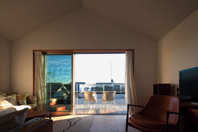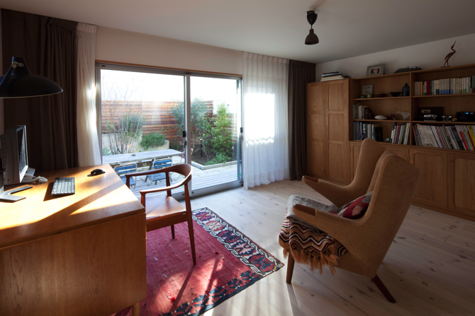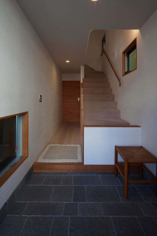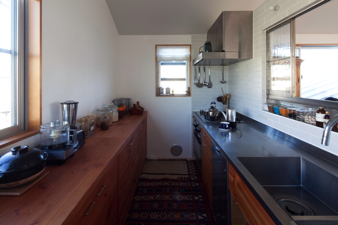 都内の静寂な住宅地で計画された住宅である。必要面積を検討してみたところ2階建てでも十分納まったが、あえて3階建てにすることにより南側に庭のスペースを確保した。そうすることで、暗くなりがちな1階スペースにも十分採光が取れ、庭とつながる部屋も生まれた。また、リビングを一番環境が良い3階に配置して、南側に広いバルコニーを設置した。リビングからキッチンは見えないように壁で隠したが、天井付近では壁をなくし空間をつなげ風が南北に通り抜けるようにすることで、できるだけエアコンに頼らない生活ができるようにした。その上で、家全体の断熱は住宅性能評価で最高の4レベルに上げた性能にしている。インテリアは家具の製作、販売をされているクライアントさんのセンスが十分に発揮されているセレクションとなっている。
