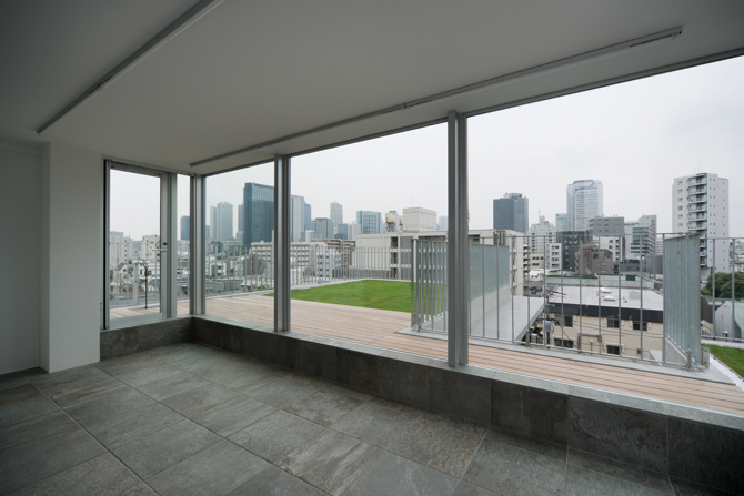 二世帯住宅は上下の階で二世帯を分けることが多いが、この家では二世帯を左右で分けて計画している。なので、それぞれの家は1階から始まり、植栽とデッキテラスがある最上階の屋上からは新宿のビル群が望める。構造はRCでボリュームも大きい建物だが、外壁の一部を木張りにして、近隣に対してできるだけ威圧感をなくし、優しい雰囲気を作りたいと考えた。