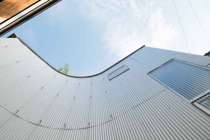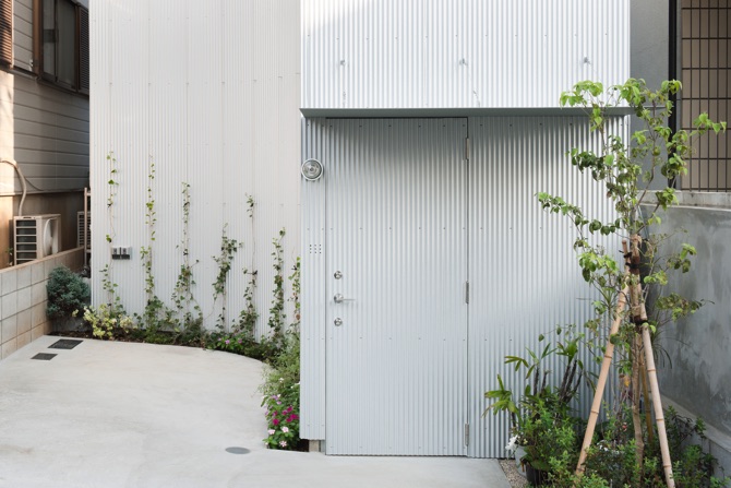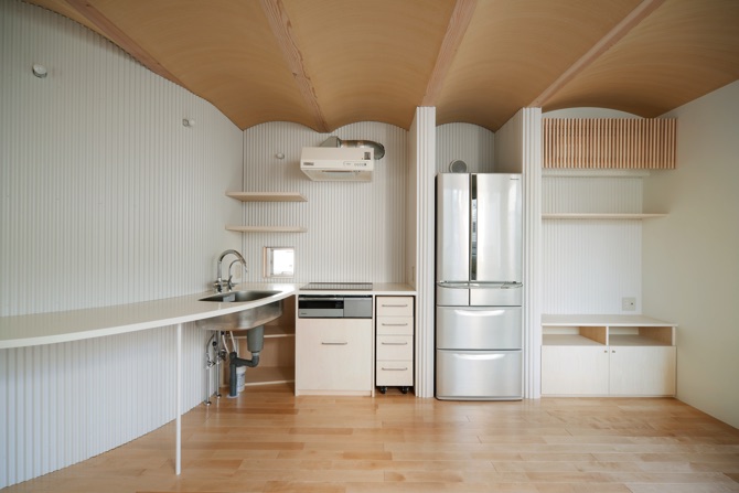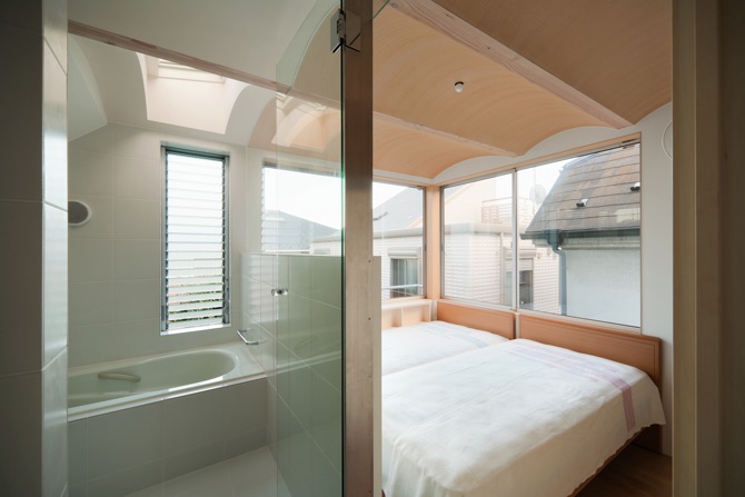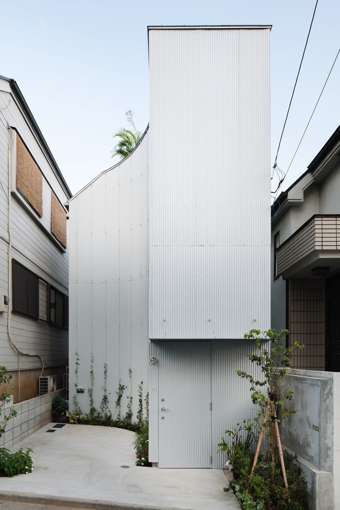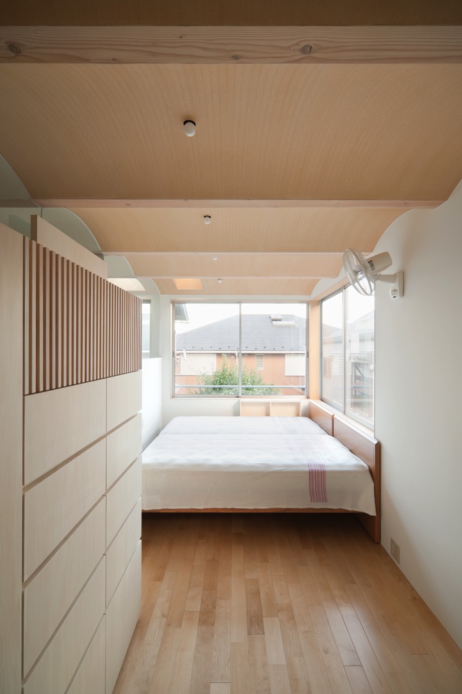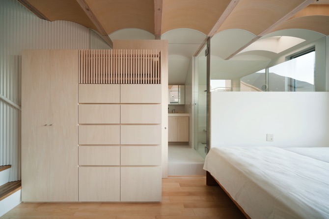 そこで、小さい敷地の上、建ぺい率 50% という厳しい条件の中でどのように建物のボリュームを削ると居心地の良い住まいになるかを検証した。その結果、円弧状にボリュームをカットするのが一番効率よく室内空間が確保できることが分かった。円弧状にボリュームカットしたあとは、おまけとして建物と道路の間に小さなポケットパークのようなスペースも残ることになった。このスペースは北側だが、柔らかい反射光が集まるのを期待して壁面緑化を施した。ここは老夫婦と隣家の方たちとのちょっとしたコミュニティスペースになればと思う。