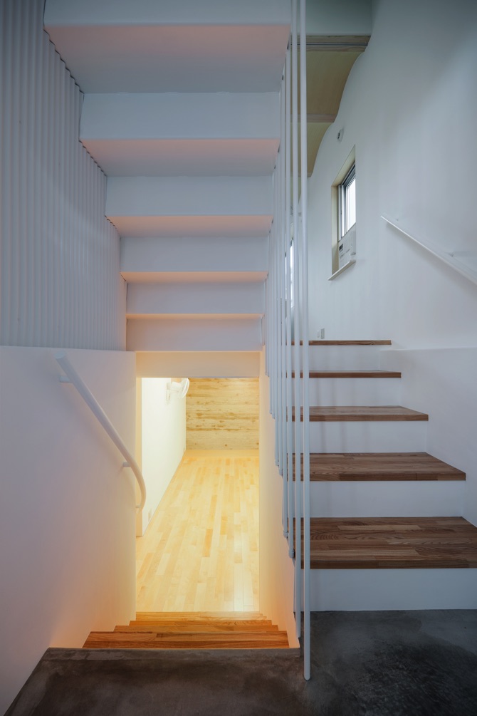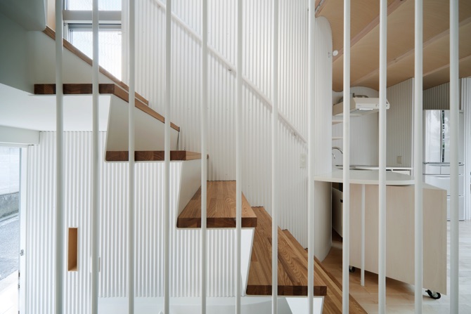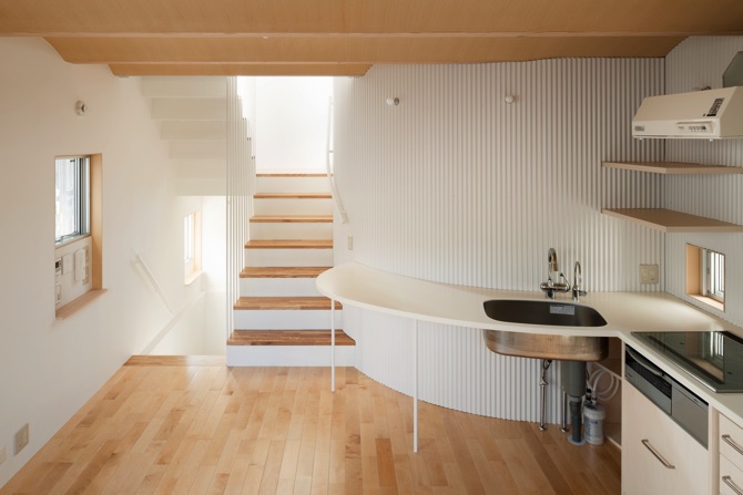 小さいボリュームの中に3層とルーフテラスを計画したため、どうしても各階の天井高は低くなってしまいがちである。そこで、天井裏の構造と照明等の配線スペースを最小限に残し波状に天井をカットすることにした。そうすることで、天井が高くなるだけでなく、空間に「ゆらぎ」や「リズム」のような効果が生まれ、実際よりも空間が大きく感じられるようになる。3階からはルーフテラスにも上れるようになっており、マンションでは味わえない生活を今後も楽しんでいただけたらと期待している。