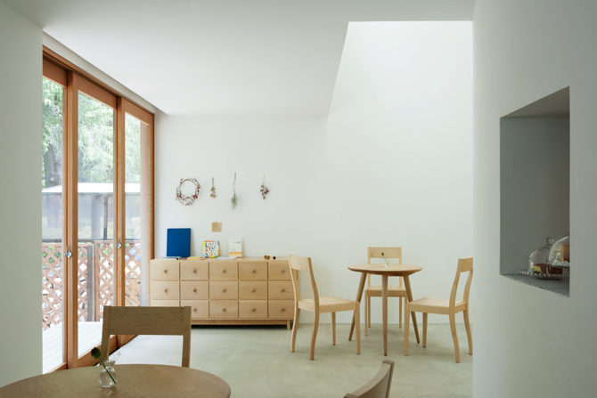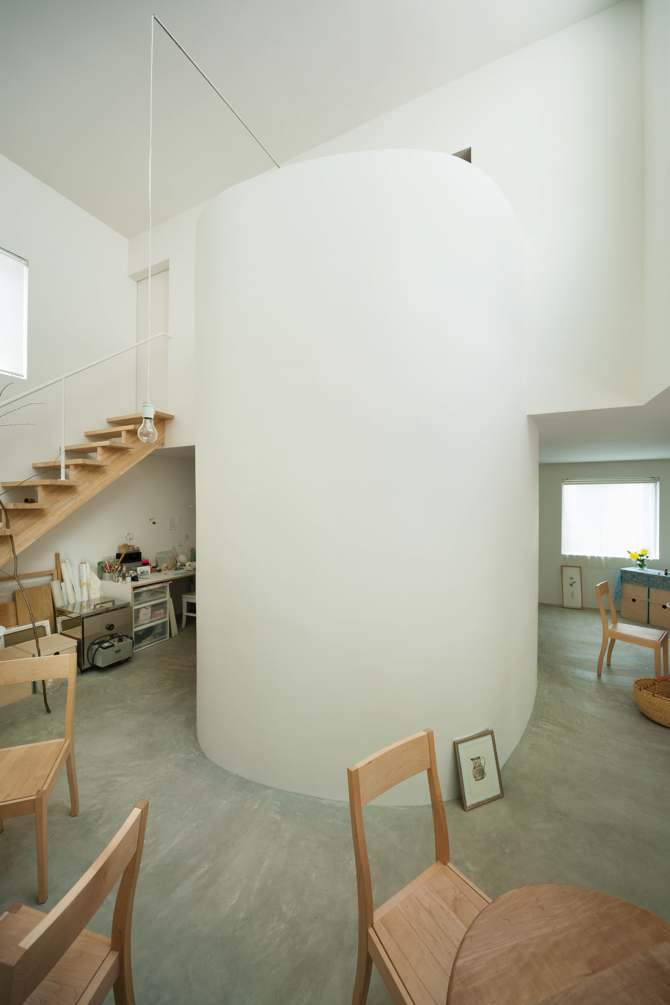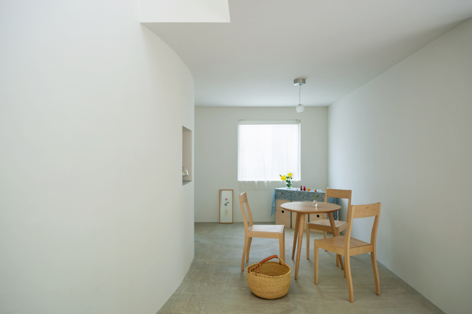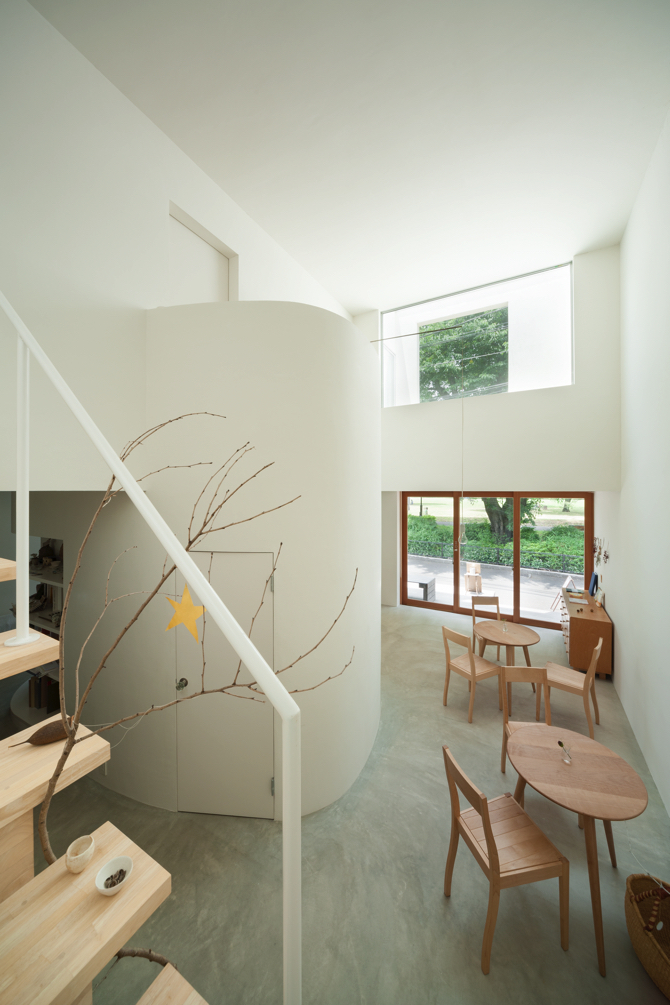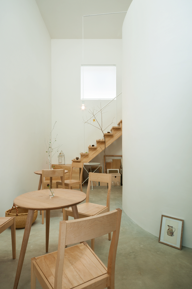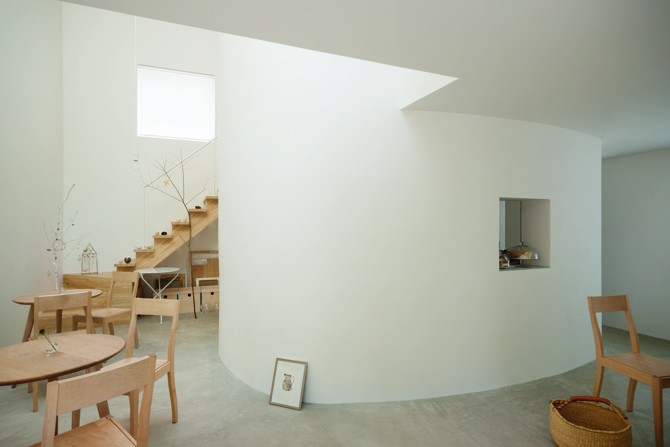 With this distorted oval, the gallery and the café are loosely divided, building a relationship which stimulates each space. At the same time, the studio is located in a private relaxing space away from the other areas.