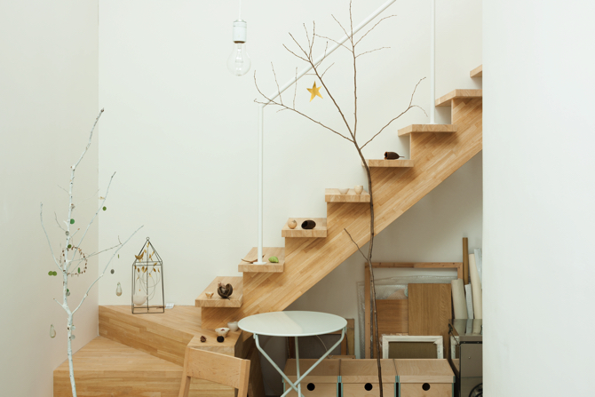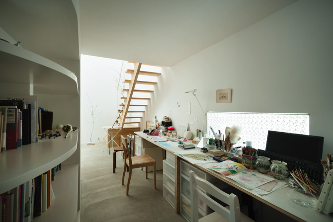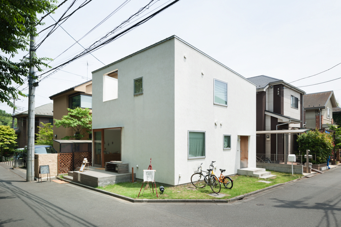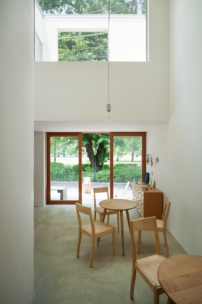 There are several relatively large parks in Musashino, Tokyo and this small building was built in front of one of them - Nogawa Park. The owners are a young married couple in their 20s. Both of them art graduates who have jobs in companies where they are able to demonstrate their artistic senses and creative skills. They dreamed of having a building like a "small art museum". They also wished for a gallery, a café, and a studio on the first floor, as well as a small living space on the second floor.