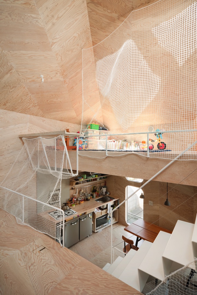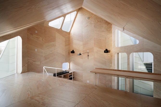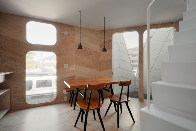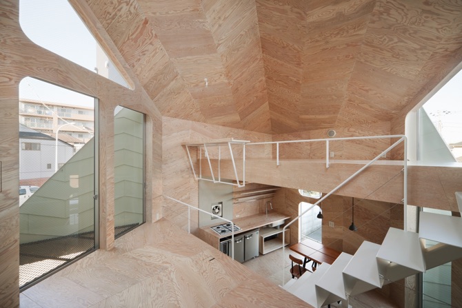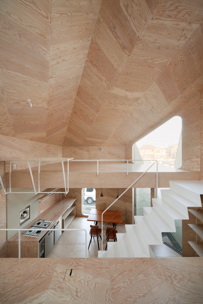 間仕切りはほとんどなく、お店と家との間もガラスがはめられた「ふすま」のようなもので、かろうじて仕切られるようにしてあるだけである。また、室内の床、壁、天井のほとんどはラーチ合板を菱形にカットしたもので仕上げた。ラーチ合板は最も安価な建築材料の一つだが、一手間掛けることで、非常に奥深い表情を持つ材料に生まれ変わる。同じく外壁のガルバリウム鋼板はメンテナンスが楽で安価な材料だが、やはり一手間掛けて、これまでにないユニークな表情を持つ外観となる。