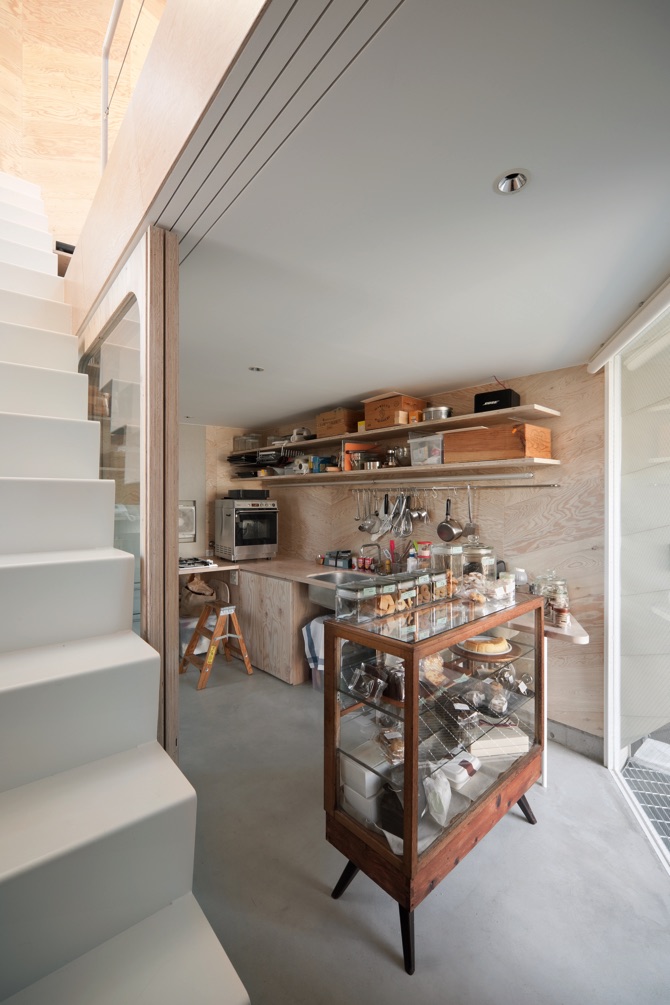 当初から、住宅の一部をクッキー屋さんにしたいというのが大きな要望の一つだった。しかし、もともと小さい敷地の上に旗竿地という条件の中で店舗兼住宅を納めるのは困難を極めた。そこで、東京にかつてからある職住一体の町屋の生活を思い浮かべてみた。それは、店舗と家とがとても近い距離で接続されているだけでなく、そこに訪れる来客とも結びついたコミュニティのある楽しい日常である。今回の計画でもそのようにお店と住宅が断絶せず、むしろ開放的で繋がっていくような構成を考えられないか、そこに住むご家族とお店に訪れるご近所のお客さんとが自然と結びついていくコミュニティが実現できないか。そんな問いから空間を考えた。具体的には1階のお店を含め5畳ほどの小さな空間を数珠状に半階ずつずらしながら垂直方向に重ねていった。高度斜線のため切られてしまう屋根部分は思い切ってトップライトにして、半階ずれた床に乱反射しながら最下階まで光が届くようにした。