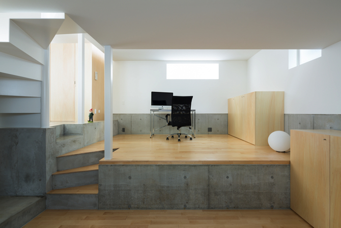Furthermore, without breaking the two-storey framework, an underfloor storage room and a roof terrace were added, so that nine different levels of floors are developed within a single house.