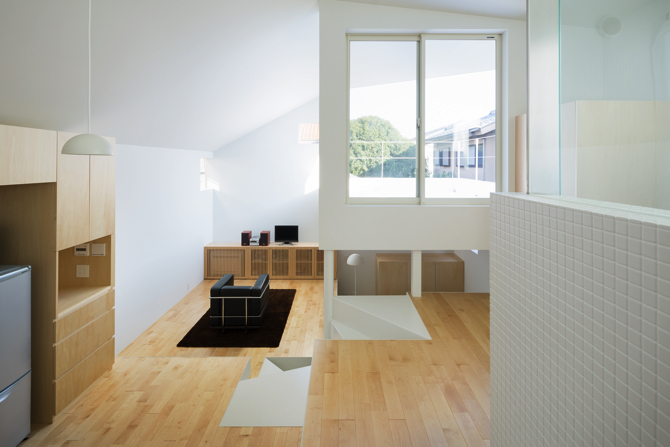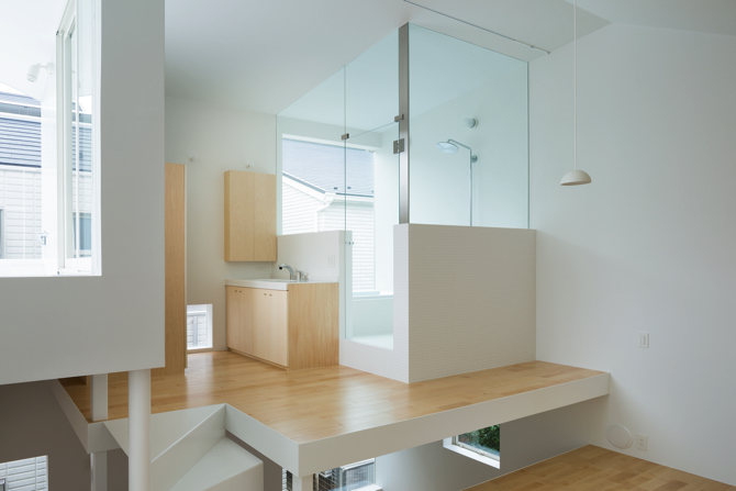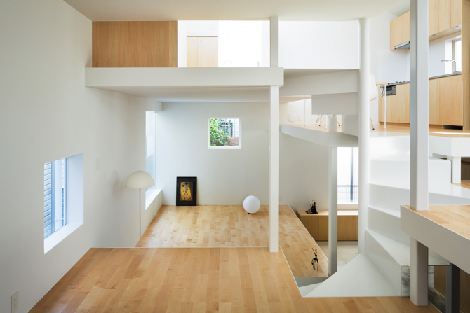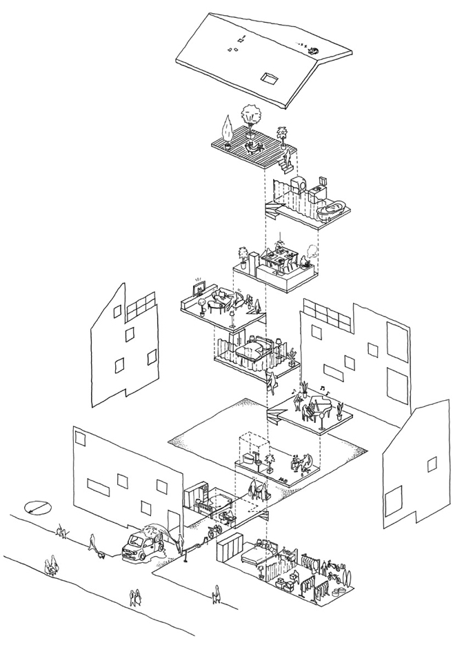 この住宅では土地の細分化の末に生まれた旗竿地をさらに4つに分割し、2階建てという枠組みの中で縦方向には8フロアに分割した。