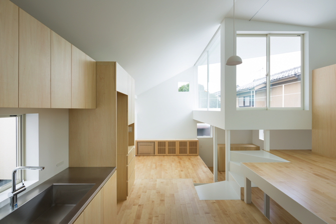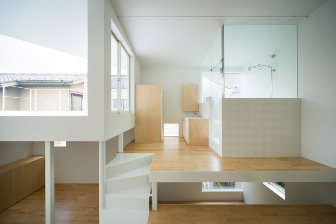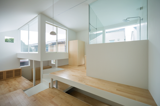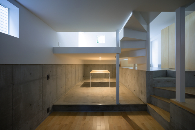 さらに、2階建てという枠組みを崩さず、床下物置とルーフテラスを加え、9つのレベルの異なる床が1つの住宅の中に展開している。